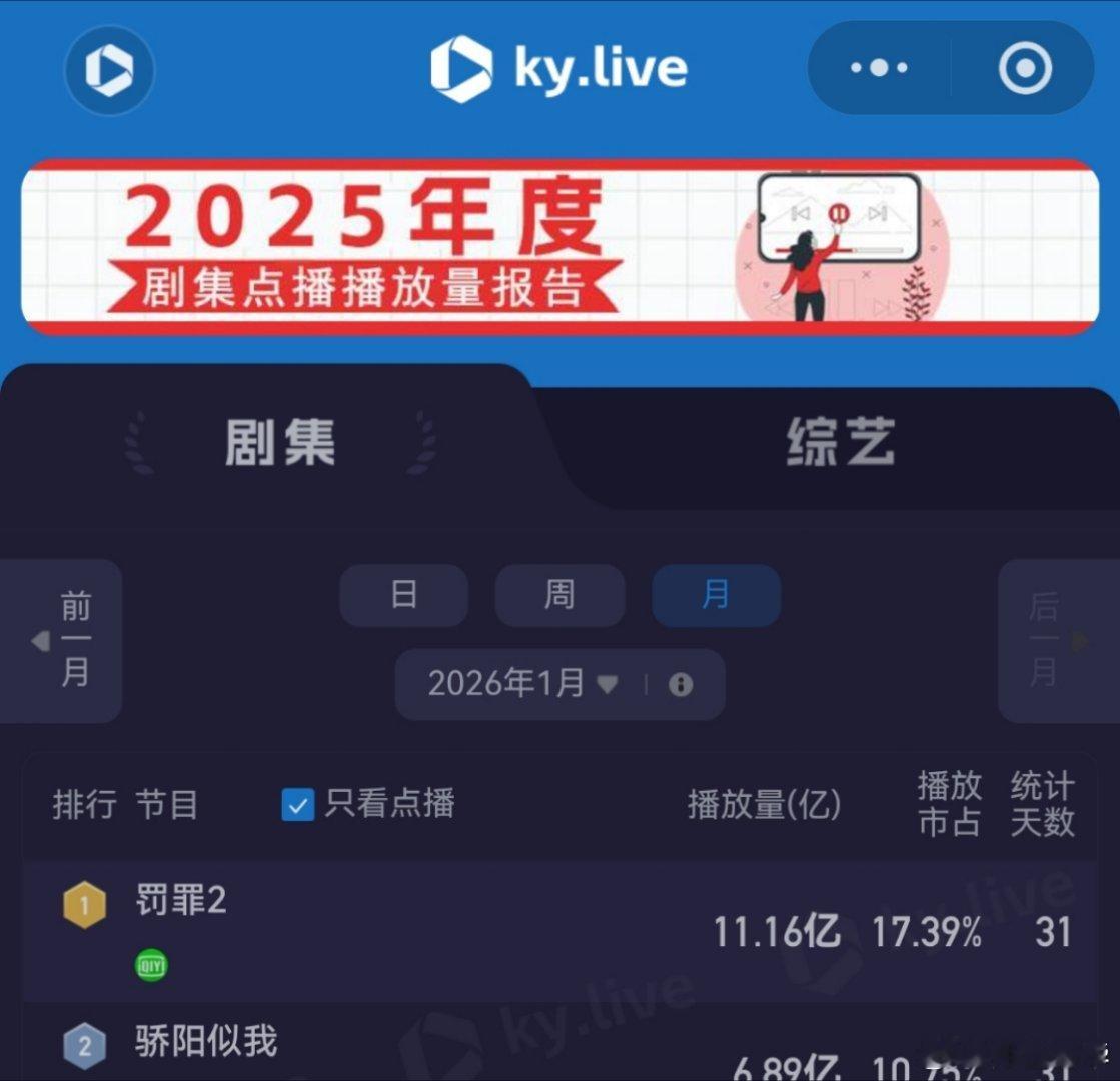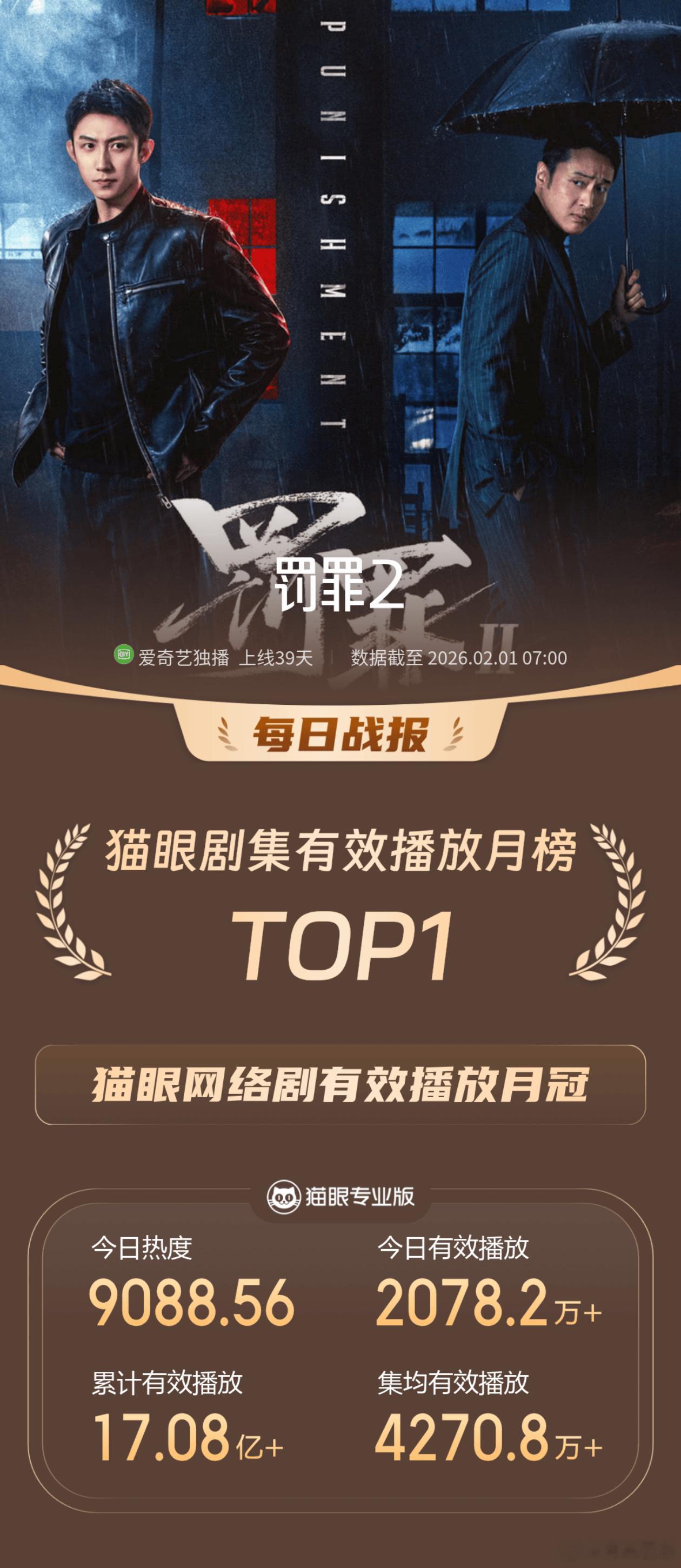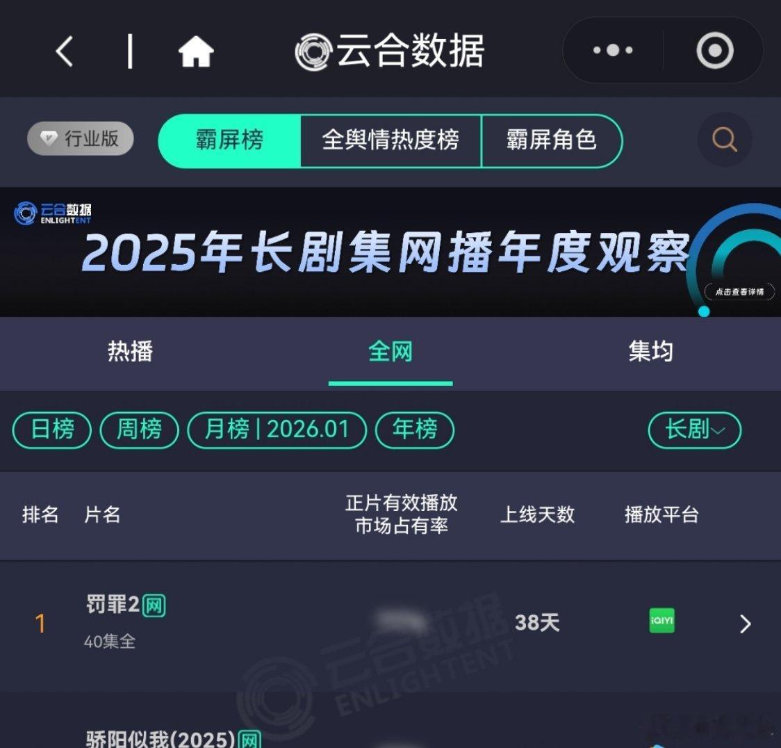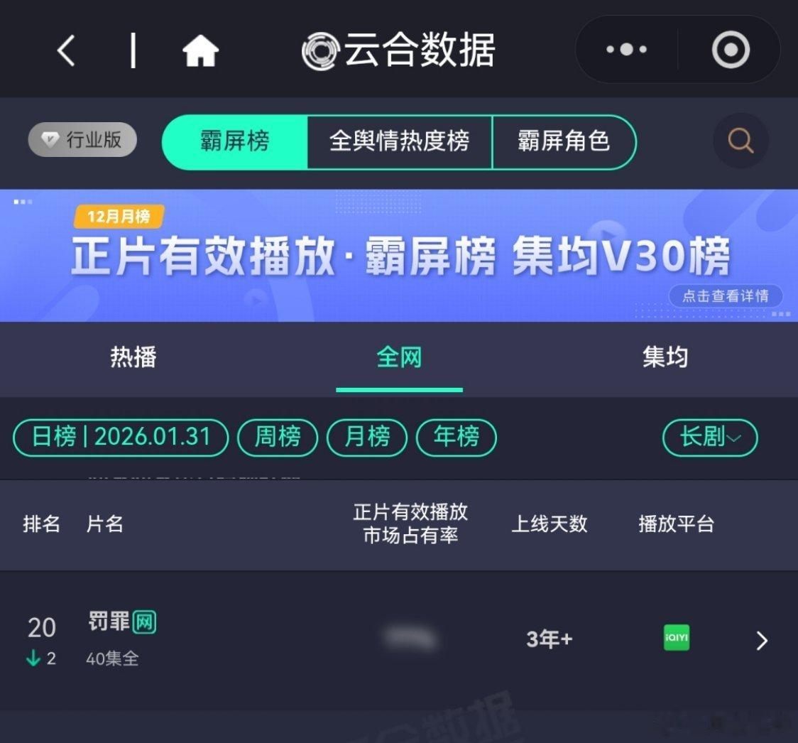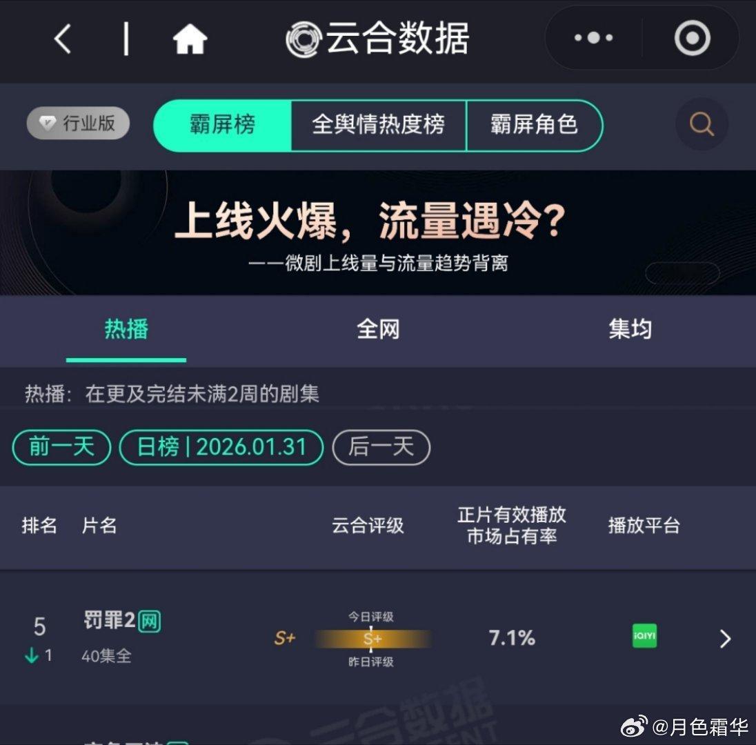 1月31日,罚罪2VIP更新结束第15天,又一个新剧超点了,今天排第5,热播期预测还有14天,罚罪,云合第20,《冬至》云合网络剧28,黄景瑜罚罪2是云合、灯塔、酷云、猫眼全满贯月冠军,《罚罪》第8个月登云合月榜(第13名)黄景瑜秦枫 。