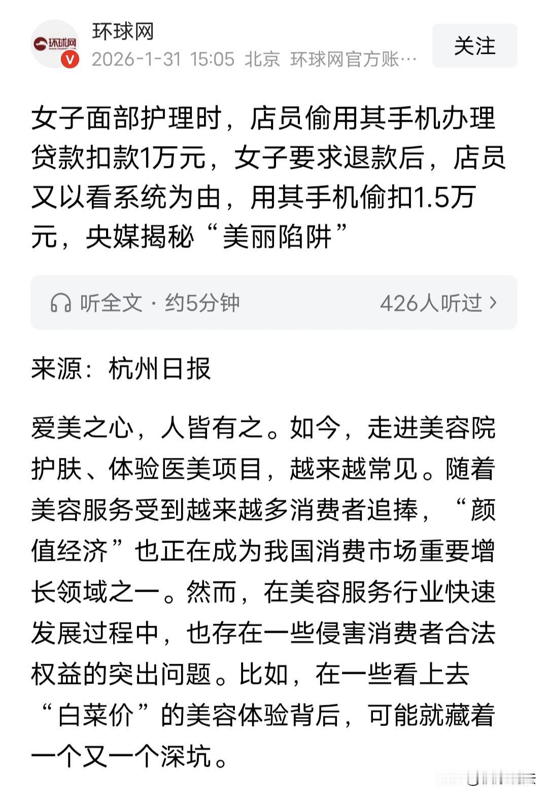 “防不胜防!”女子网上看到一则16元体验祛痘的广告,便去店里体验,不料,店员私自拿女子手机贷款10000元,女子火冒三丈要求退款,店员却说她用了产品,不能退。几天后,女子越想越气,又找店家退款,店员假惺惺的说帮她看一眼系统,结果,又用女子手机扣了15000元,网友:这不是盗窃吗? 2026年1月份,罗女士在网上闲逛时,被一则“16元超值祛痘体验”的广告深深吸引,一想到自己皮肤有点小问题,便毫不犹豫地决定前往一试。 然而,这看似便宜的诱惑,实则暗藏玄机,一场精心布置的消费陷阱正等着她。 罗女士满怀期待地踏入美容店,本以为只是价格便宜,一次简单的祛痘体验。 不料,店员看着她的脸一番“专业”审视后,竟神色凝重地告诉她:“您的皮肤问题严重,一般的护理指定不行,得用这里的1万元特效治疗才行。” 罗女士一听,心里咯噔一下,连忙摆手说自己囊中羞涩,无力承担如此高昂的费用,对于店员提出的贷款建议,更是连连摇头拒绝。 罗女士觉得自己就是想祛个痘,没想做贵的,如果钱多就没有必要了,毕竟谁的钱也不是大风刮来的。 可谁知,这美容机构竟是“套路深似海”。 在罗女士闭眼享受面部护理的片刻宁静时,店员竟偷偷摸摸地拿起她的手机,一番操作猛如虎,神不知鬼不觉地为她办理了贷款,还直接扣款了一万元! 罗女士醒来得知此事,简直是一个头两个大,你怎么不问问人家就随便拿手机办了贷款?要求对方赶紧退款。 但店员却以“产品已开封使用,概不退换”为由,将她拒之门外,态度强硬,毫无商量的余地。 你看这美容机构不仅设下低价诱饵,引君入瓮,还胆大妄为,私自操作顾客手机贷款,简直是明目张胆,肆无忌惮。 几天后,罗女士不甘心,再次来到店里,誓要讨个说法。可没想到,又中招儿了。 店员见状,眼珠一转,又生一计,以“查看系统,协助退款”为幌子,再次偷偷摸摸地拿起罗女士的手机,一番操作之后,又悄悄扣走了15000元! 罗女士本来就是想把钱要回来,可没想到,对方的套路深似海,让她防不胜防,罗女士气得差点没晕过去。 像罗女士遇到这事,作为普通消费者也确实防不胜防,一些经营者以低价体验为诱饵,如同“姜太公钓鱼,愿者上钩”,实则暗藏玄机,强行推荐高额服务项目,套路数不清。 店家在罗女士未充分知情或明确同意的情况下,就擅自为其办理“消费贷”,让消费者在不知不觉中背负债务,简直就是坑人。 罗女士对此也是欲哭无泪…… 有网友说,如果事实真实的话,这就不是什么消费陷阱了,而是盗窃。不报案吗? 也有网友怀疑,手机没有个密码啥的么?各种支付都有密码、扫码、面部识别各种条件的啊,这样的店员是怎么忽悠的? 还有人说,估计被忽悠瘸了,然后后悔了,美容院有一套话术,专门牵着你的鼻子走。 这件事就是,店里先用16元祛痘体验做诱饵,把顾客骗进店,然后夸大其词、制造焦虑,高价推销产品,顾客不接受就偷偷贷款、强行消费,这就是典型的消费陷阱。 很多商家就是看准了消费者贪小便宜的心理,一步步把人套进去,防不胜防。 那么,店员私自拿罗女士手机贷款、扣款构成盗窃罪吗? 《刑法》第264条规定,盗窃公私财物数额较大的,处三年以下有期徒刑。 罗女士明确拒绝贷款和消费,店员趁她闭眼护理、无法察觉的时候操作手机,两次偷偷转走了总共2.5万元,这就是典型的“秘密窃取”。 虽然这事是在美容店里发生的,但本质和趁人不备偷走手机里的钱一样,而且数额已经远超了多数地区500到2000元的盗窃入罪标准。 所谓的“产品已开封”不能洗白盗窃行为。就算做了护理,那也是美容店通过非法手段强塞给顾客的服务,法律不会认可。 罗女士的遭遇,也给我们提个醒,在面对低价诱惑时,一定要保持清醒头脑,切莫贪小便宜吃大亏。