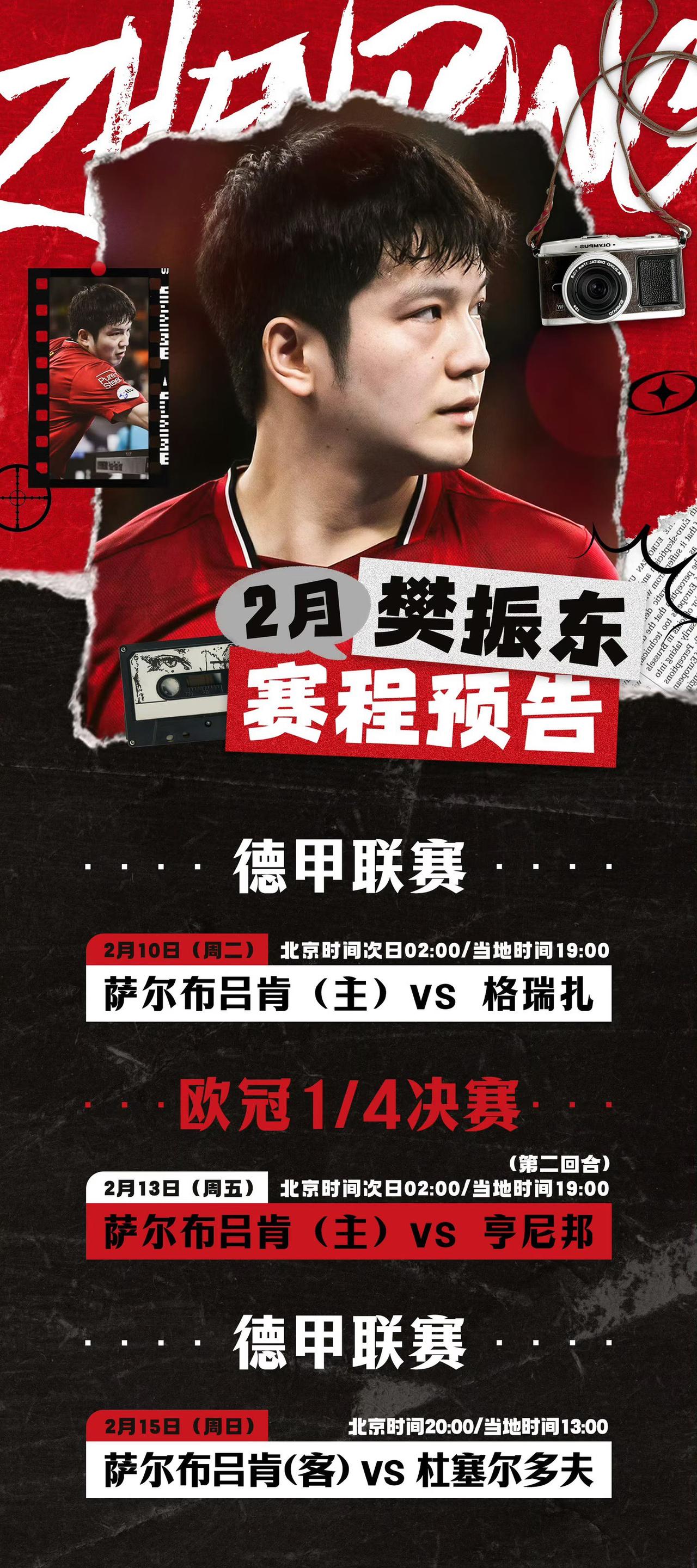 樊振东二月赛程预告——值得提前收藏一下哦 2月10日,北京时间次日2:00, 德甲联赛 萨尔布吕肯VS格瑞扎! 2月13日,周五,欧冠1/4决赛 第二回合,北京时间次日2:00, 萨尔布吕肯主场迎战亨尼邦, 2月15日,周日,德甲联赛, 次日凌晨两点, 萨尔布吕肯VS杜塞尔多夫! 二月份的这几场比赛, 樊振东都确定出战, 二月份的比赛,有点多, 东哥加油, 特别是2月15日,对阵杜塞尔多夫, 邱党也许打一单, 东哥加油!