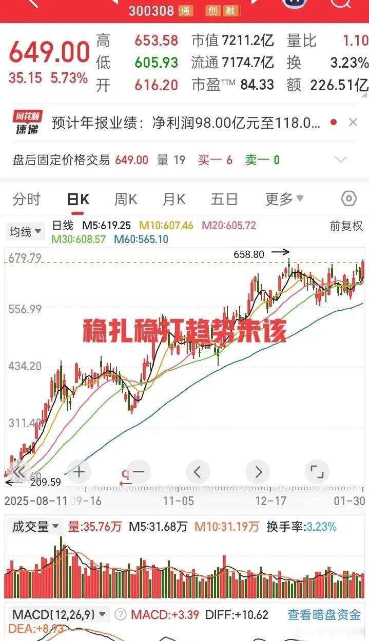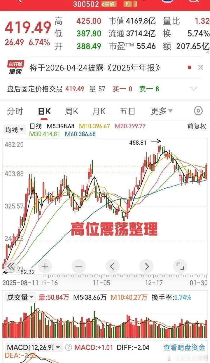 从走势上来看,寒武纪最近跟大盘背道而驰,大盘向上,它反而向下调整,目前也达到了前面的支撑位。新易盛属于高位震荡整理的过程,只有一个中际旭创不断的延续上涨势头!