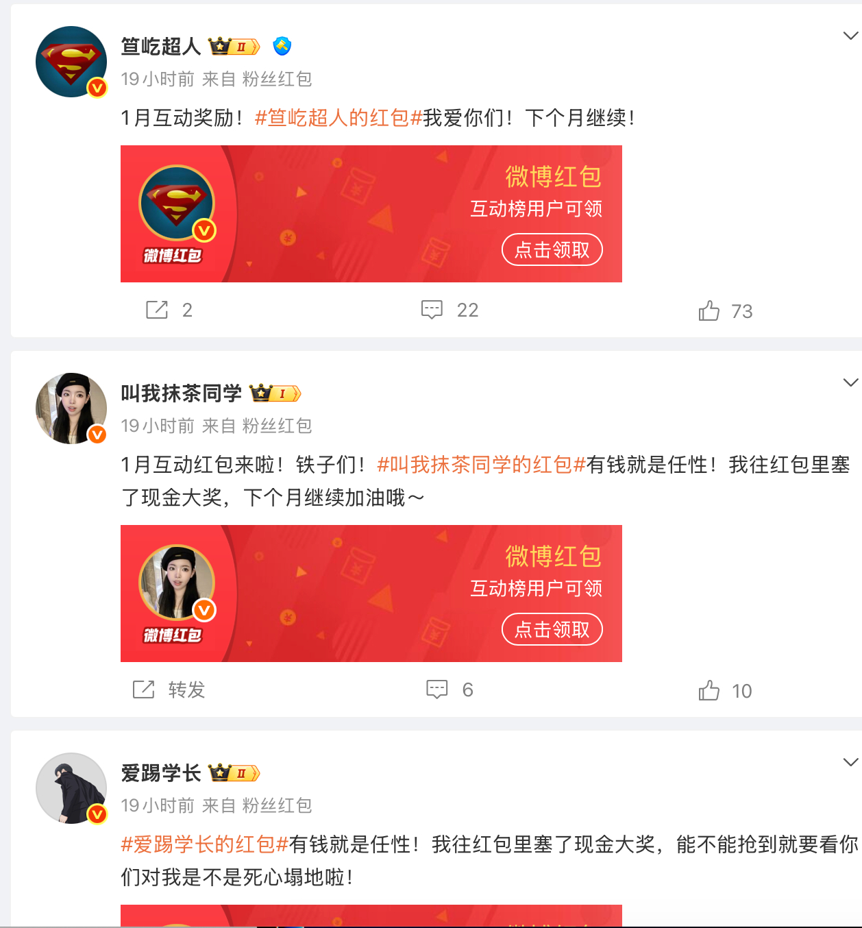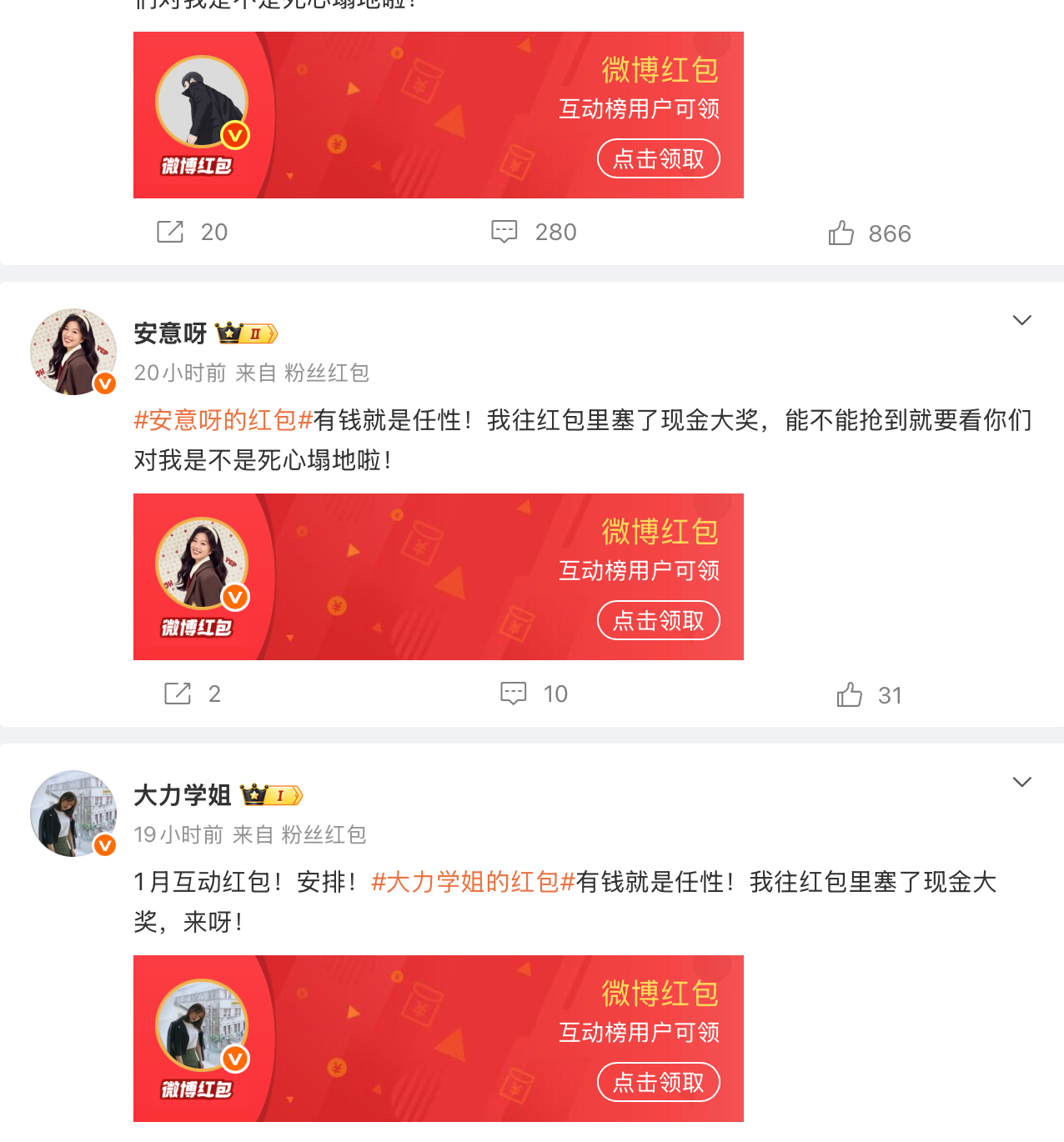 咋回事,咋都是在发红包啊!你看吧,我就说微博的粉丝是最幸福的,微博博主是最“苦”的,没事就得给粉丝发红包,要不就是抽奖,抽各种,伺候的舒舒服服的!而某音那边,天天喊你掏钱买东西,对吧!所以,粉丝们一定关注这些博主,没事多关心夸夸他们,好吗
