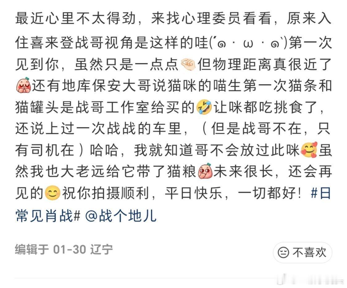 肖战不会放过任何一只猫咪肖战锦州拍戏入住喜来登,在地库发现一只猫咪,然后这只猫吃到了肖战工作室拿来的猫条和罐头,这猫还去过肖战的车里耍。