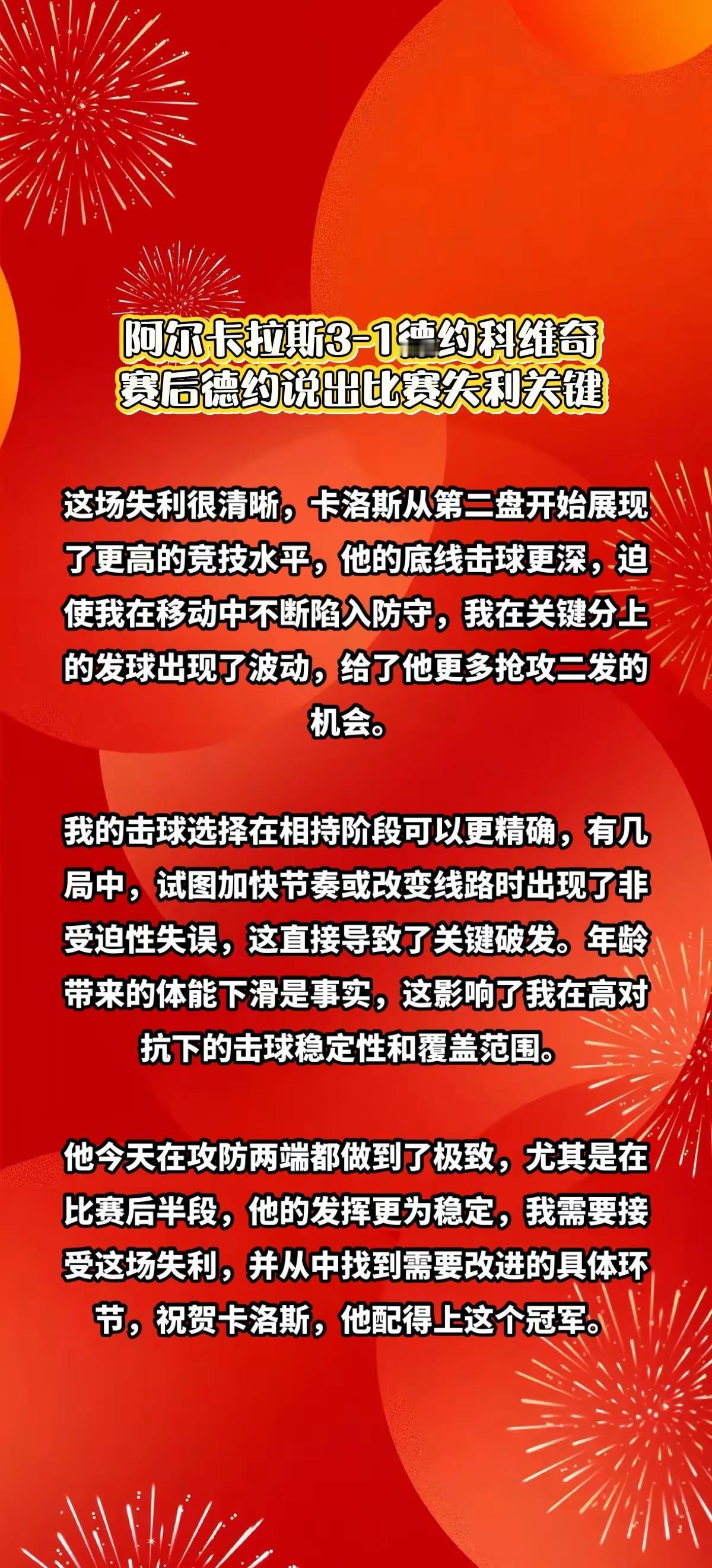 卡拉斯3-1德约科维奇,赛后德约说出关键。