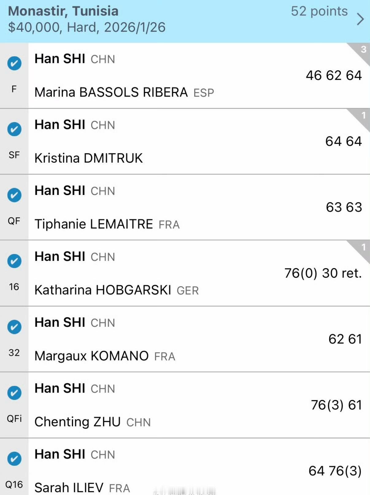 从资格赛打起连胜七场夺冠,施晗做到了!ITF莫纳斯提尔W50决赛: 施晗以4-6/6-2/6-4逆转四号种子巴索尔斯夺冠,收获52分,即时排名330。这个冠军让她的排名直接上升109位。 施晗是中国05后新生代女网选手,2024年巅峰期排名235位,2025年底遭遇9连败,排名跌至434位。