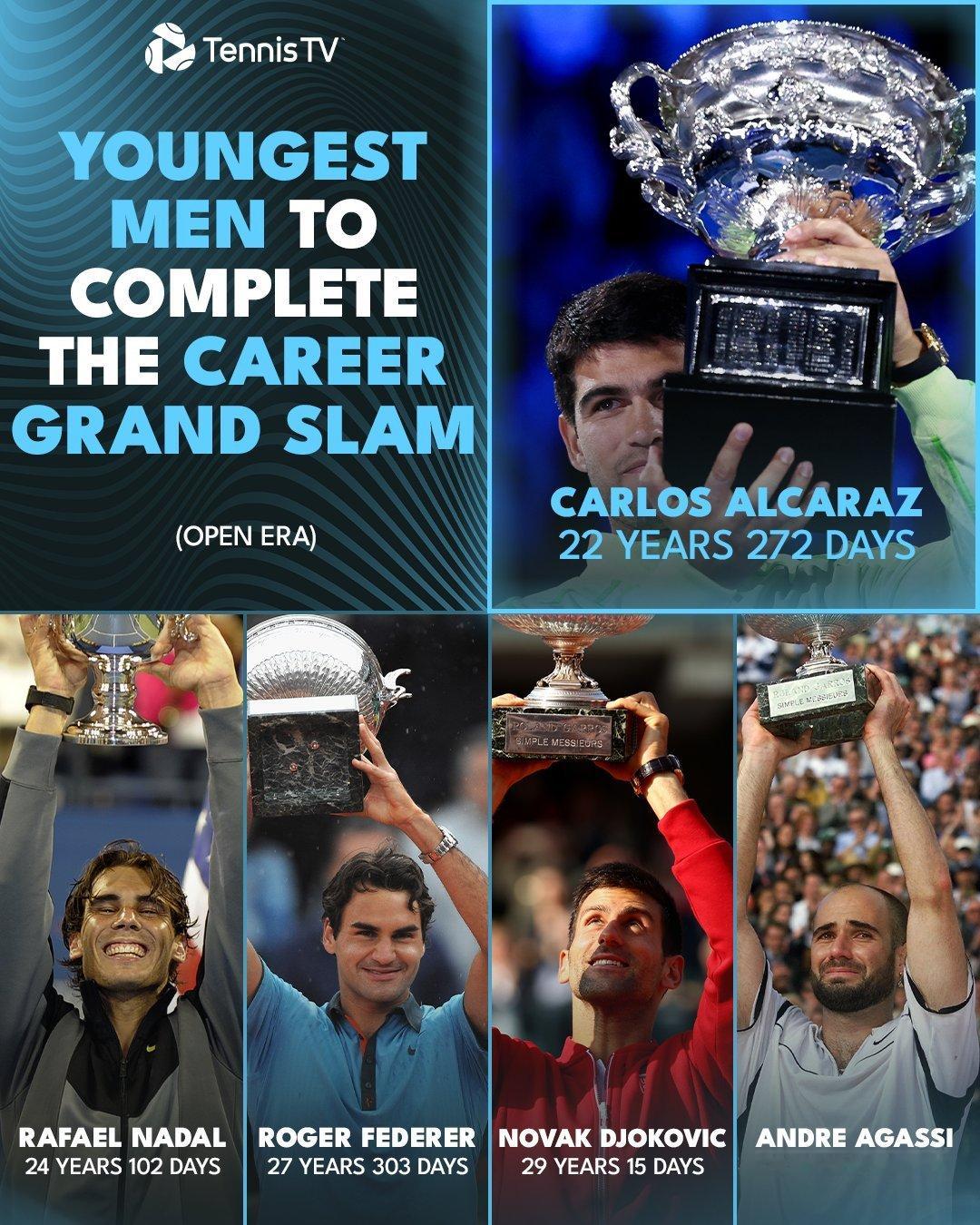 即便就是“单圈”全满贯,22岁272天实现的阿卡,也明显超越了24岁102天的纳达尔。费德勒27岁全满贯,德约和阿加西都是29岁。