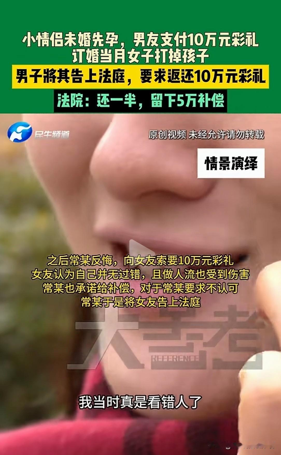 妥妥的渣子!吉林延吉,女子未婚先孕,男友给了10万元彩礼,还没结婚登记,两人闹掰。女子打掉肚里的胎儿,男友承诺补偿5万后又反悔,还起诉女友,称双方并未同居,要求返还10万元彩礼,法院判了。 常某和袁某,经人介绍认识,两人彼此看对眼了,就谈起了恋爱。 两人感情可好了,情到浓处就睡一块堆了,结果一不小心袁某怀孕了。 未婚先孕传出去,好说不好听,两人就商量着,先把婚事定下来,等生孩子前就结婚。 这样,大人孩子也有个名分。 订婚的时候,按照当地的习俗,常某给了女友10万块钱作为彩礼。 两个人本是打算尽快登记结婚,开始新生活的。 可计划赶不上变化,订婚后没多久,两个人之间就闹起了矛盾。 具体为了什么事,外人不太清楚,总之这矛盾让结婚登记的事搁浅了,一直没办成。 袁某和未婚夫闹掰了,直接提出分手,对方也马上同意了,两人还都挺坚决。 既然和男方分手,肚子里的孩子在留下也无意义,当月,袁某去医院做了人工流产手术。 这件事,常某是知道的,从头到尾他都知情。 手术之后,不知道是出于愧疚,还是想缓和关系,常某对女友做出了一个承诺。 他跟女友说,愿意给她5万块钱,作为对她身体和心理上所受伤害的补偿。 然而,这个承诺就像一阵风,过去就过去了。 常某事后却反悔了,他绝口不提那5万块钱补偿的事。 转脸向女友索要,当初给出去的10万块彩礼。 他的理由很直接:她又不和我结婚,彩礼自然该退,不能赔了夫人又折兵。 女友这边当然无法接受,她觉得,事情走到这一步,自己并没有什么过错。 怀孕又流产,对身体是实打实的伤害。 还有女人最珍贵的名声,就算自己以后在结婚,说不定会被嫌弃。 不管怎么说,吃亏的总是女人。 常某当初亲口承诺的补偿,怎么能说反悔就反悔? 现在不仅补偿没了,连彩礼都要全部拿回去,这于情于理都说不通。 所以,袁某拒绝了常某要回彩礼的要求。 一个坚决要退,一个坚决不退,两个人谁也说服不了谁。 常某见协商无望,干脆一纸诉状,把女友告上了法庭,要求判决女友,返还全部10万元彩礼。 法庭上,双方各执一词,争论不休。 常某强调,两人订婚后并没有实际共同生活,法律意义上算不上真正的夫妻关系。 既然最终没有办理结婚登记,那么赠与彩礼的目的就没有达到,女方理应返还。 他还特别提到,女友做流产手术的实际花费,只有2422元,远不到5万那么多。 而袁某则陈述了从订婚、怀孕到流产的整个过程。 她提交了一份关键的证据,一段通话录音。 录音里,常某清晰地承诺了会给她5万元,作为流产的补偿。 这份证据让常某事后“反悔”的行为,变得确凿无疑。 袁某认为,自己并非无故拒绝结婚,双方是因矛盾未能成婚。 且自己为这段关系付出了健康的代价,常某的承诺是对此的确认和弥补,在这种情况下,全部返还彩礼显失公平。 一审,法官仔细听取了双方的陈述,核对了证据,尤其是那段录音。 经过审理,法院认为,虽然双方未办理结婚登记,原则上彩礼应予返还。 但本案中存在一些特殊情形。 女方在订婚时已怀孕,并因故终止妊娠,确实遭受了身体上的伤害。 常某在知情后,主动承诺给予5万元补偿,这一承诺是其真实意思的表示,应当予以尊重。 这5万元,可以视为对女方所受伤害的一种抚慰,也是对彩礼金额的一种合情合理的折抵。 因此,一审法院判决,女方无需返还全部10万元,只需返还其中的5万元即可。 常某对这个判决结果不服。他提起了上诉。 他坚持认为,两人并未同居,流产费用很低,自己当初的承诺只是一时情急。 不能因此就扣减5万那么多。 在上诉请求中,他要求改判女方返还9万元彩礼。 二审,法院重新审视了全部案情和证据。 那段录音证明,常某承诺补偿五万元的录音,成为了本案一个非常有力的定案依据。 它表明常某本人,当时也认可,需要对女方进行一定的经济补偿。 这种补偿的承诺,与女方因流产所受的伤害、以及双方未能成婚的遗憾结果是相关联的。 依据《高院关于审理涉彩礼纠纷案件适用法律若干问题的规定》第六条规定: 双方未办理结婚登记但已共同生活,一方请求返还按照习俗给付的彩礼的,法院应当根据彩礼实际使用及嫁妆情况; 综合考虑共同生活及孕育情况、双方过错等事实,结合当地习俗,确定是否返还以及返还的具体比例。 按说常某和袁某,未办理登记手续,原则上彩礼是应当返还的。 但袁某存在订婚时怀孕并流产,这一特殊情况。 她因流产身体遭受伤害,常某知情后,承诺给予5万元补偿。 这一承诺可视为对袁某伤害的抚慰,也可看作是对彩礼返还金额的一种约定。 袁某未婚先孕又流产,确实承受了身体和心理的双重压力,如果让她全额返还彩礼,有失公平。 最终,二审法院做出了裁决:驳回常某的上诉,维持原判。  对此,你怎么看? 关注@赵哥的法律观。