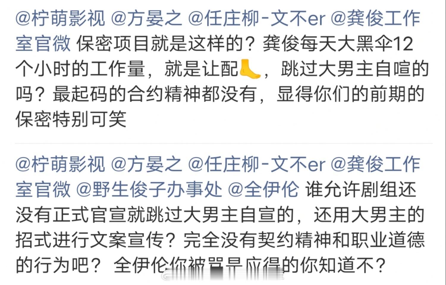 《凤舞九天》网传阵容为陆小凤龚俊、花满楼全伊伦、西门吹雪郑业成。全伊伦今天发布了一组写真,和他共创的摄影师用的原始文案是“凤舞九天”,改文案后还抱怨为什么不能用成语,莫名其妙。龚俊粉丝认为剧组前期的保密工作,都被演员自宣毁掉了,全伊伦拍摄了带花满楼元素的古风写真,摄影师还用陆小凤的大招“凤舞九天”进行文案宣传,还是剧名,配角跳过大男主自宣,简直太闹心了。