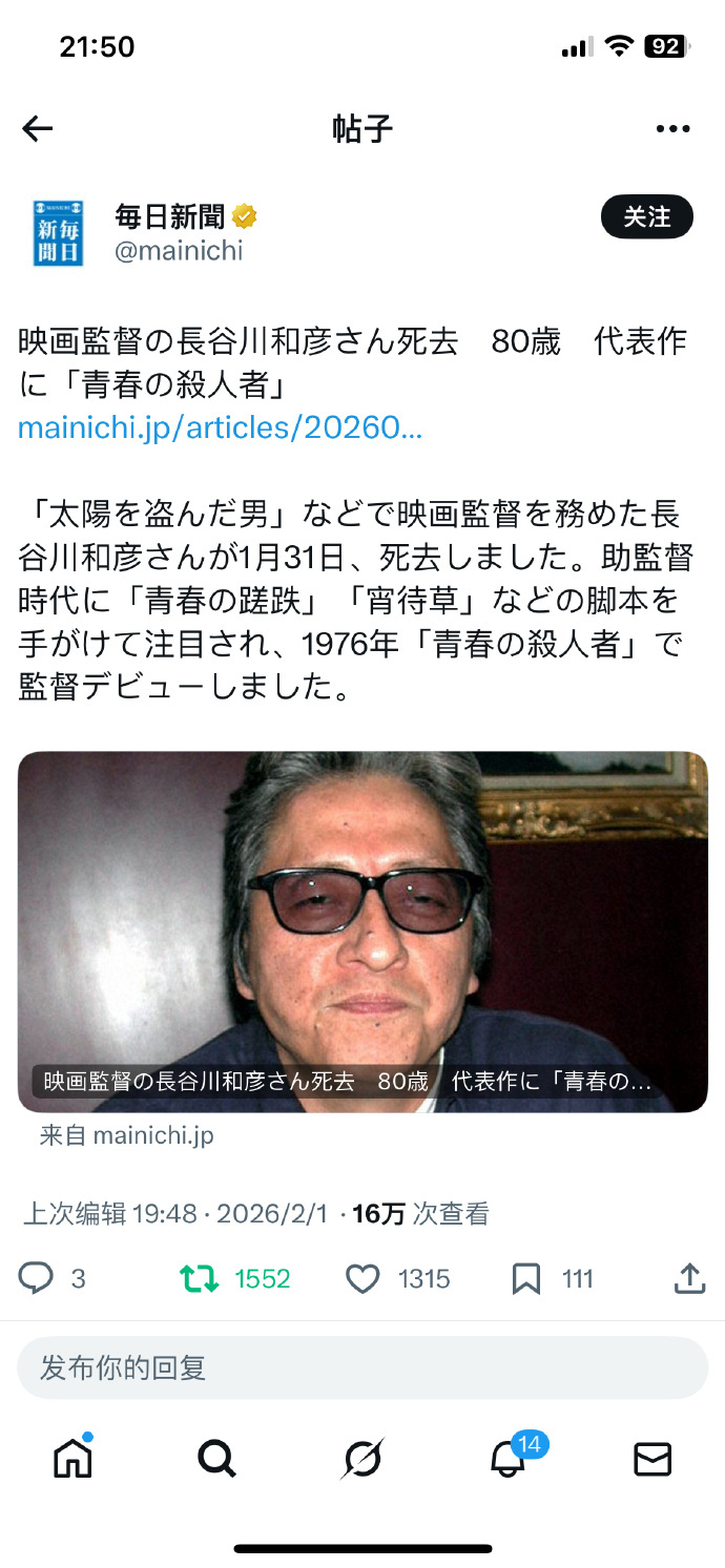 日本导演长谷川和彦去世长谷川和彦去世 日本导演长谷川和彦去世,享年80岁。他曾执导《青春之杀人者》《盗日者》等代表作,是日本电影界重要导演之一。他亦曾参与创立“导演公司”(ディレクターズ・カンパニー),该公司因1991年拍摄事故及资金问题于1992年解散。