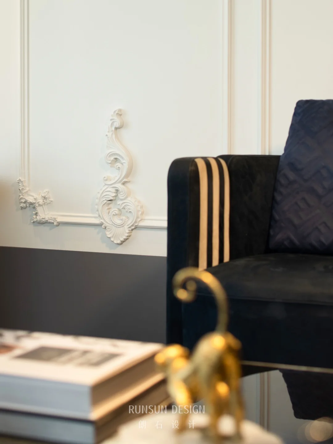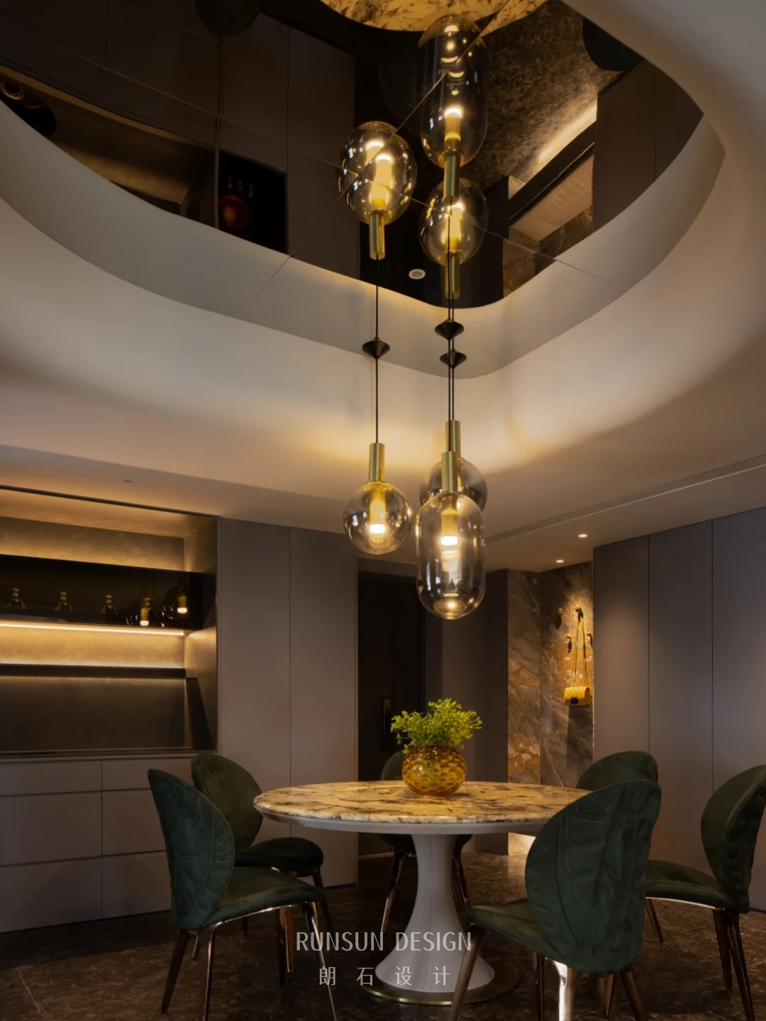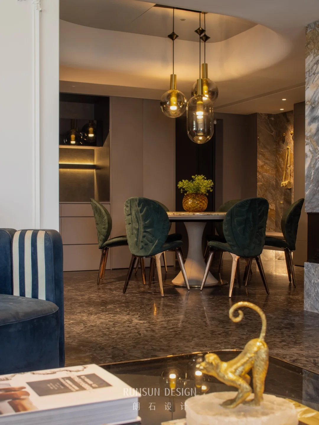 本套设计通过金属、丝绒、大理石、玻璃等材质的碰撞, 以及深蓝、墨绿、香槟金等色彩的搭配, 在现代轻奢的框架下,注入了法式浪漫的细节, 既满足了舒适的居住功能,又塑造出富有格调的视觉体验。