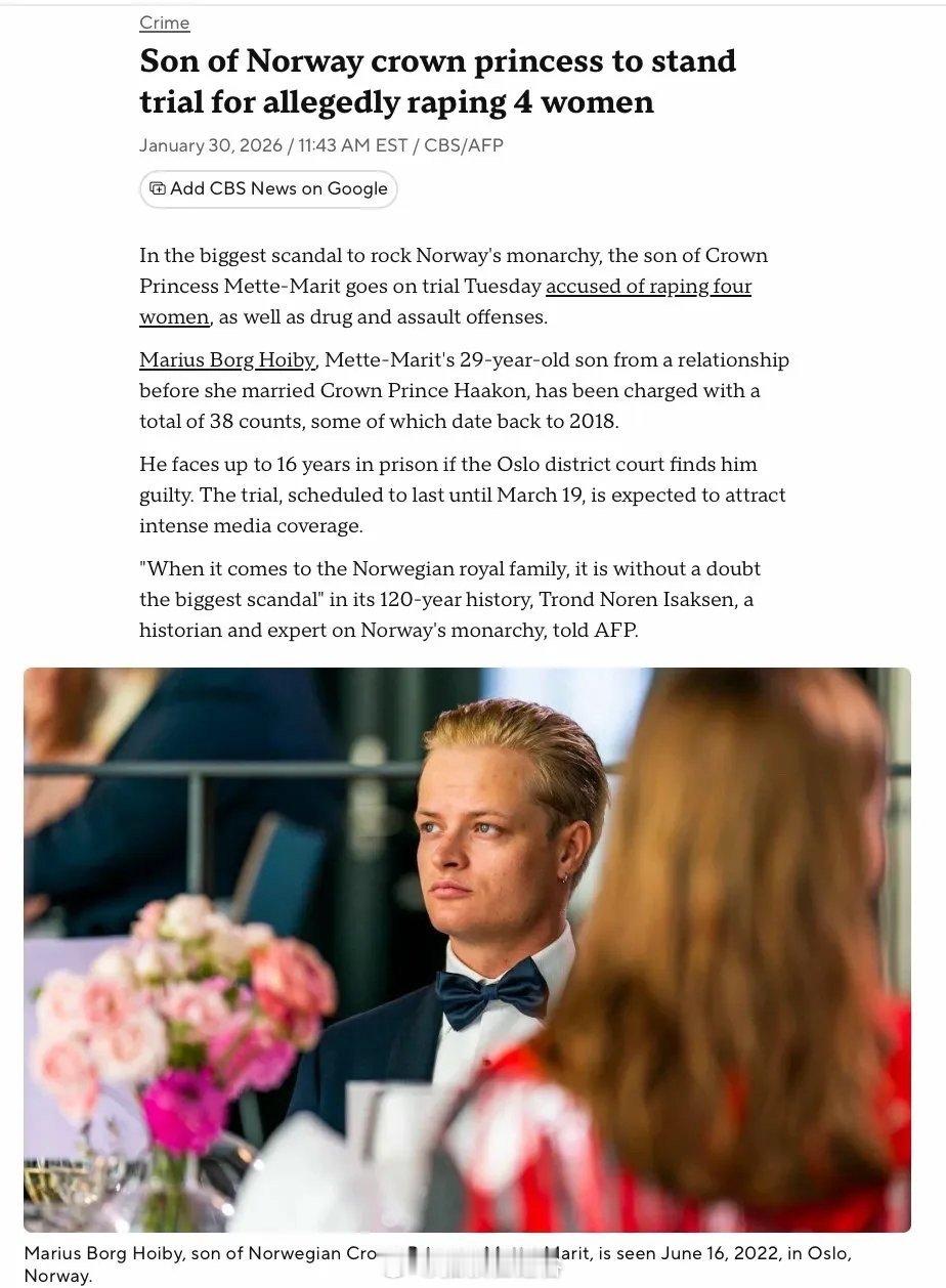 这个儿子(她嫁给挪威王储之前生的),马里乌斯·博格·霍伊比(Marius Borg Høiby),如今面临38项刑事指控,其中包括四项强奸罪。审判于周二开始。