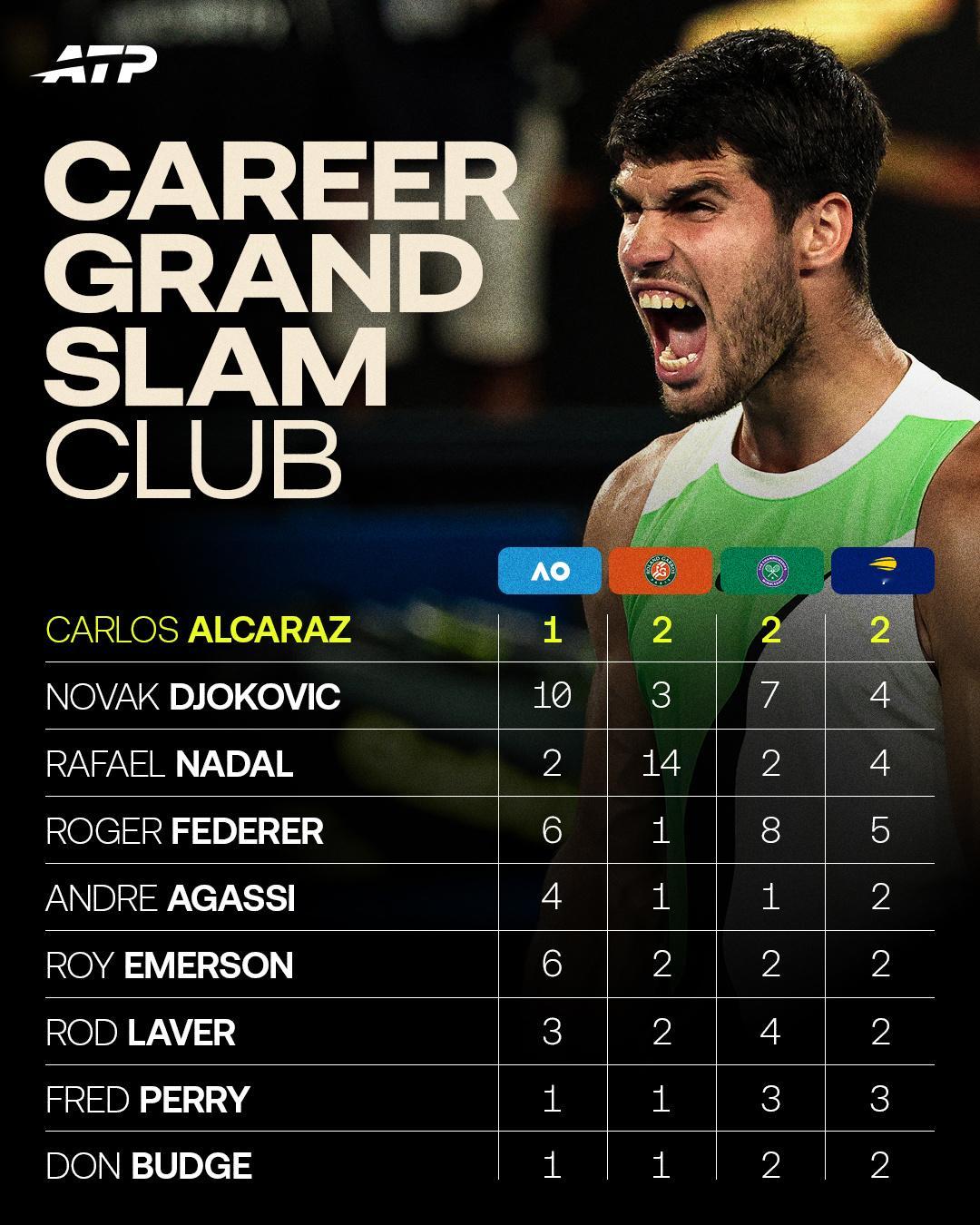 首次称霸澳网的阿尔卡拉斯,成为历史上第9位完成职业生涯全满贯壮举的男子球员,正式加入网坛最顶级的俱乐部