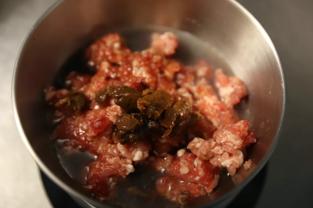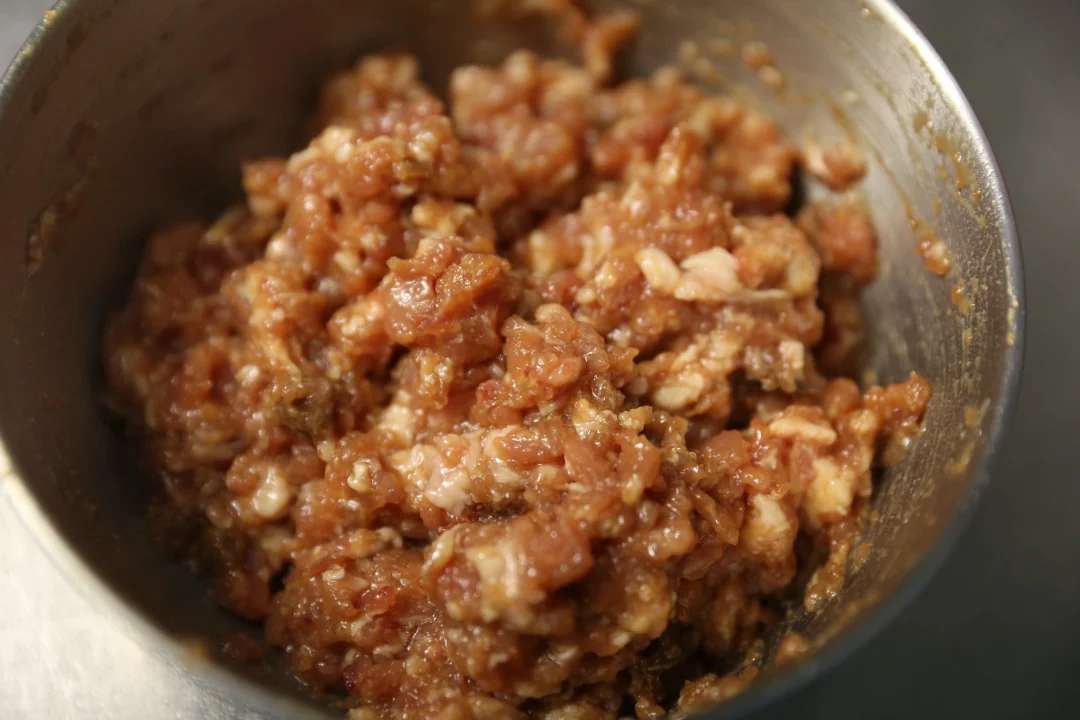 2:在鸡腿肉颗粒中或者猪绞肉中加入腌肉酱汁,腌制一会儿。