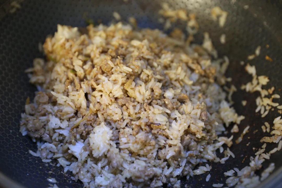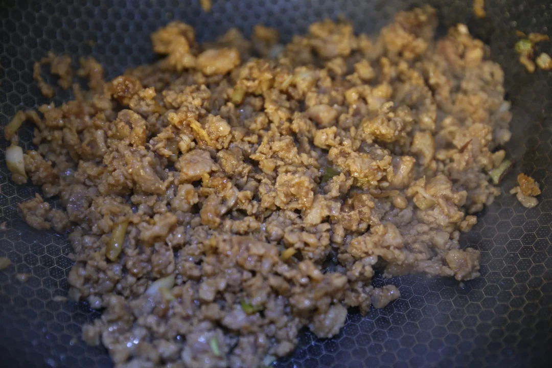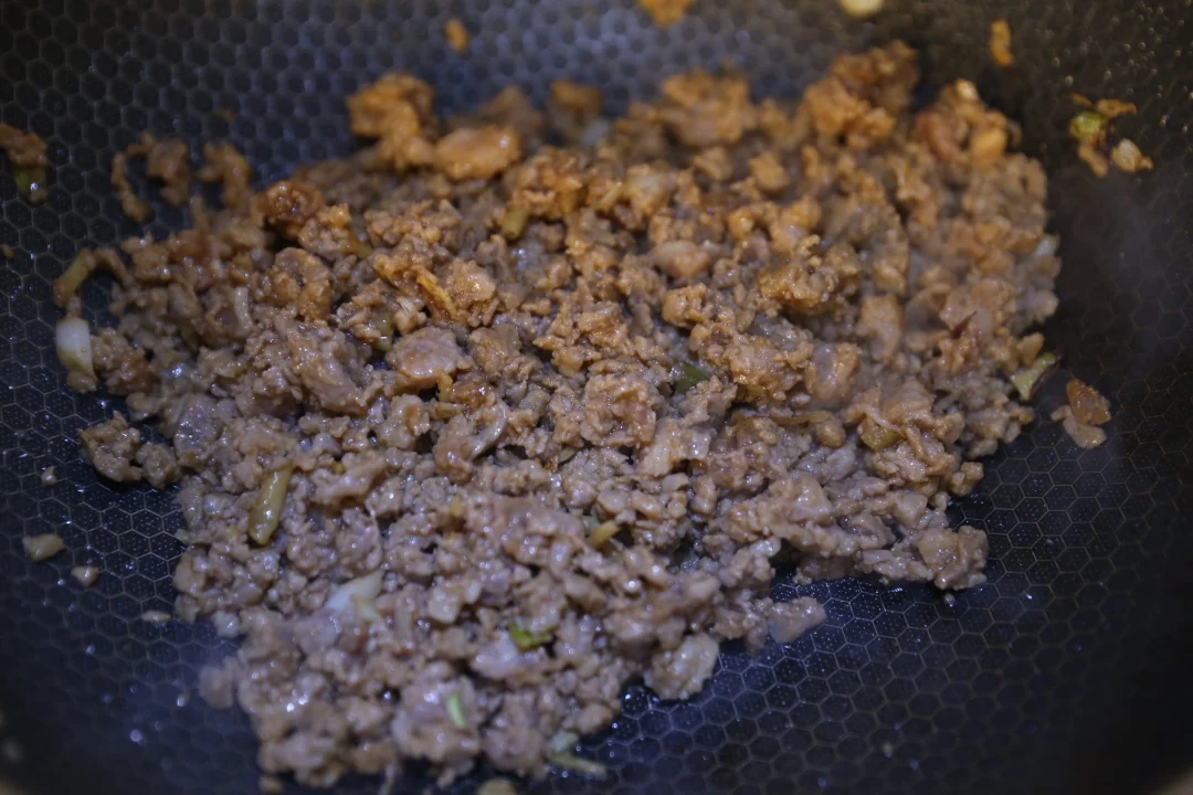 5:同一个平底锅,开中火,加入腌制好的绞肉。
