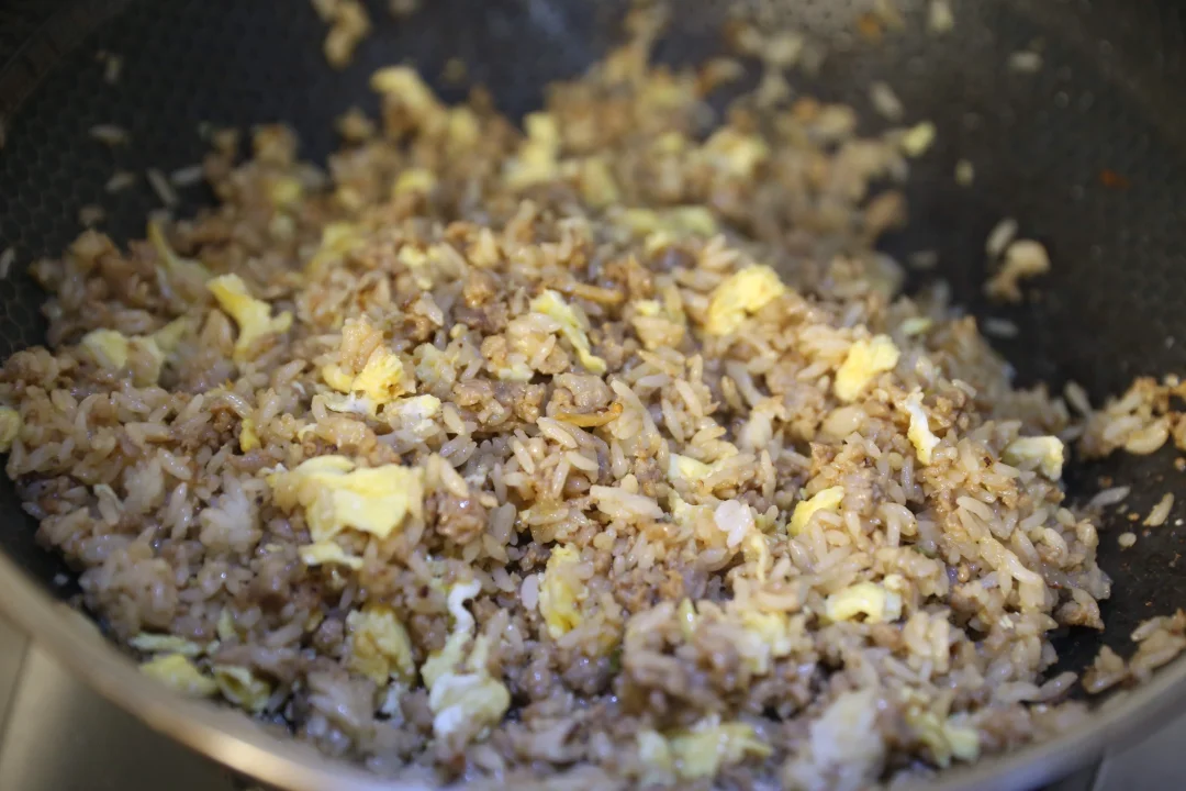 7:加入白饭,搅拌均匀,加入炒好的鸡蛋,均匀拌散。