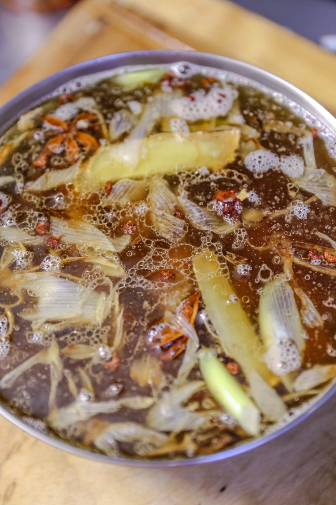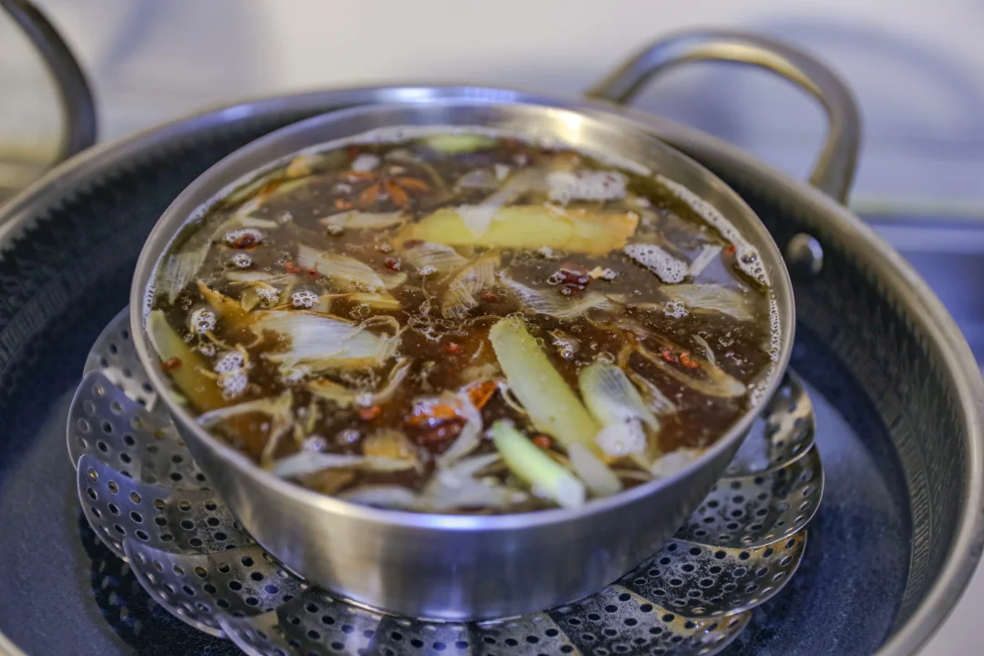炸好的丸子不仅可以空口吃,也可以做汤。做汤的方式也有很多种,今天的这种方式是用蒸的方式。用锅里放一点点底油、葱姜爆香,八角、花椒、干辣椒煸炒,加入水,放入盐、鸡粉、味精、胡椒粉、酱油,老抽一点,一点十三香,开水适量,开锅蒸一个小时。