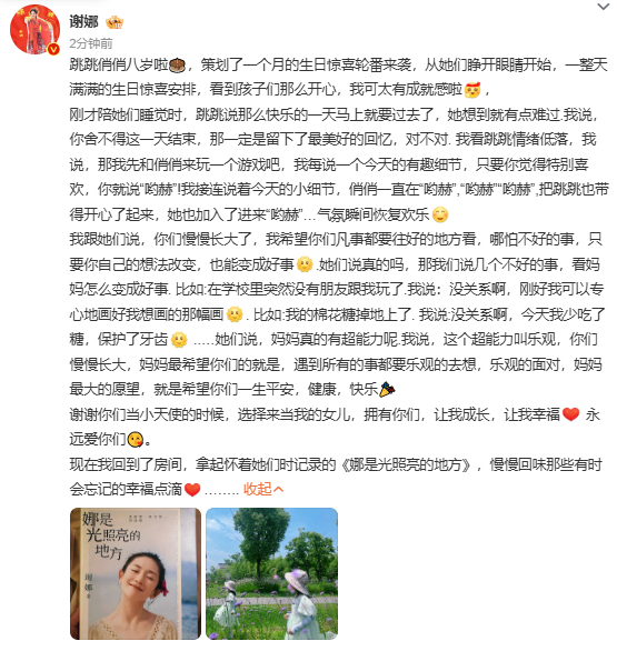 谢娜庆祝跳跳俏俏八岁生日谢娜为跳跳俏俏生日策划了一个月惊喜 发文庆祝双胞胎女儿跳跳俏俏八岁生日:“策划了一个月的生日惊喜轮番来袭,从她们睁开眼睛开始,一整天满满的生日惊喜安排,看到孩子们那么开心,我可太有成就感啦”“谢谢你们当小天使的时候,选择来当我的女儿,拥有你们,让我成长,让我幸福 永远爱你们😘”随后转发:“好妈妈、好妻子,好幸运跳俏八岁!好快乐🎉”张杰谢娜为双胞胎女儿庆生