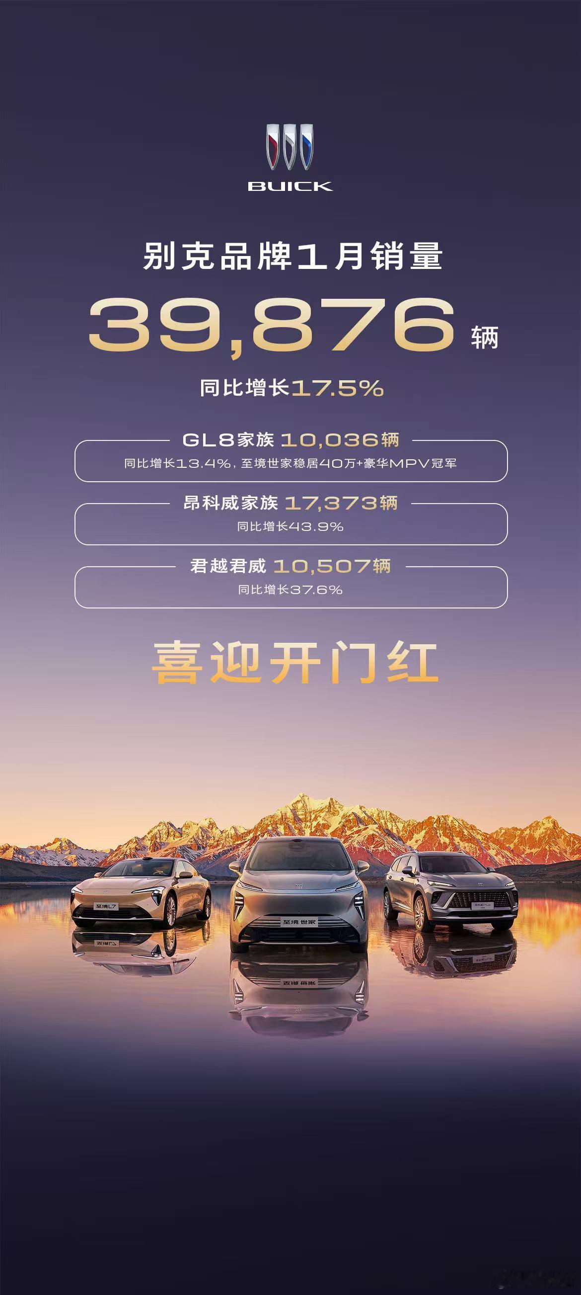 别克喜迎开门红别克品牌1月销量39,876辆 同比增长17.5%🚗GL8家族10,036辆,同比增长13.4%。至境世家稳居40万+豪华MPV冠军🚗昂科威家族 17,373辆,同比增长43.9%。昂科威Plus获15-20万级2.0T SUV销量第一🚗 君越君威 10,507辆,同比增长37.6%