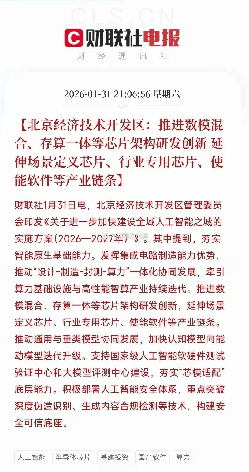 重大利好消息!而北京经济技术开发区要继续推动数模和存算一体芯片架构创新!那么在存算一体芯片的发展要实现行业专用芯片,更是要发展自己的软件等产业链!要推动设计加制造智能算力一体化协同发展!这是要打造整个芯片制造产业链!实现真正的国产芯片自主发展!上海同样在加速推动AI人工智能的快速发展。要打造更多的智能化应用,在制造行业深耕落地!AI人工智能结合机器人,不是单一的产业链发展,而是更多集成路径的发展!主要是结合AI人工智能,实现智能智慧化的发展方向!对芯片需求,算力需求,存储芯片的需求,甚至模式芯片的需求都将大幅增加