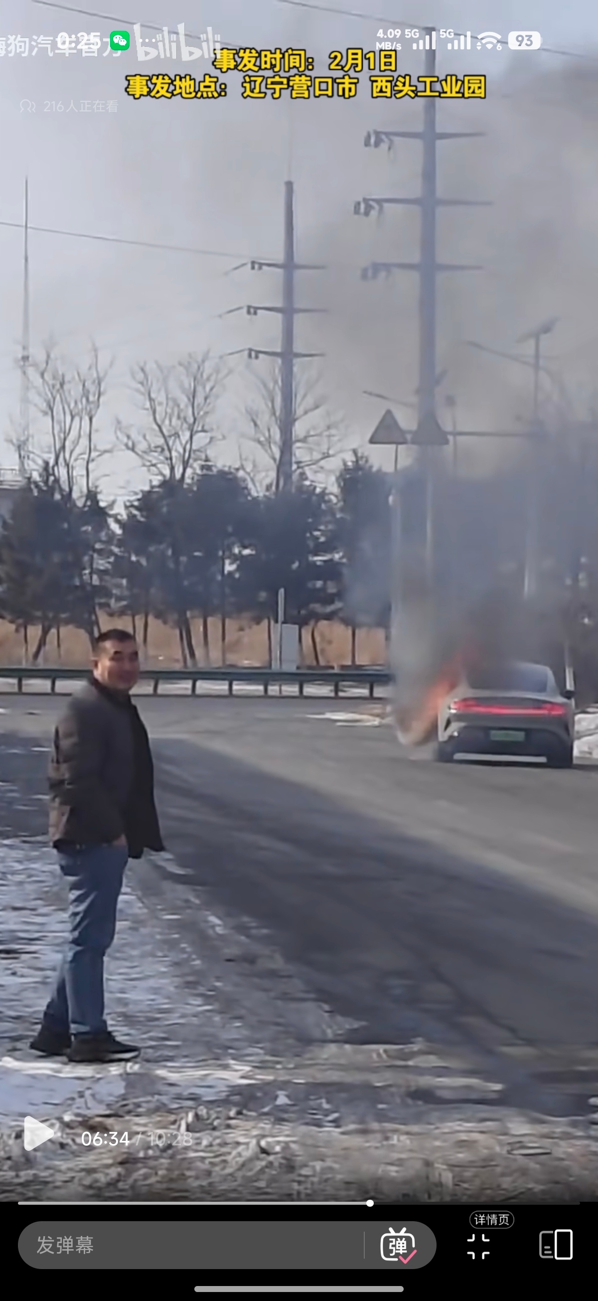 后来火势比较大的时候车还在打双闪,说明即使是到了这个时候,电池包依然没有燃烧,否则温度就会击穿前舱小电瓶。