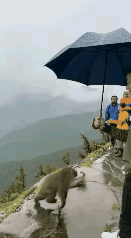 猴子去抢客人手里的伞,没想到开始空中旅行了。