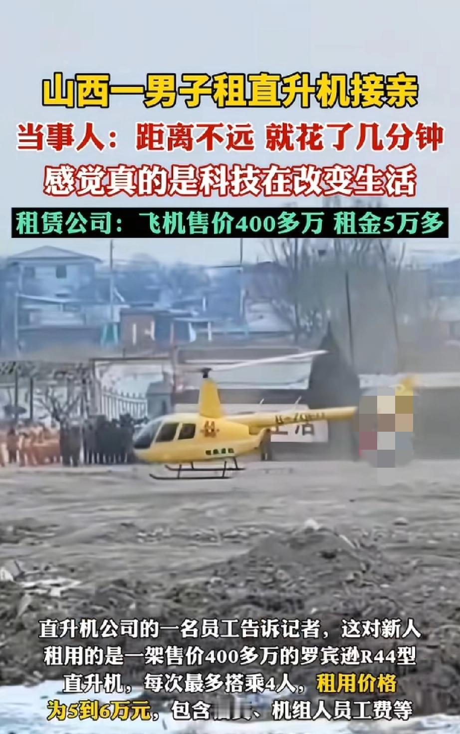 5万块钱都够买大金镯子了,山西大哥却租直升机接亲! 这架罗宾逊R44直升机售价400多万,租金5万多,算下来每分钟花掉小一万,油钱都够摆3桌酒席了,新郎说就是图个新鲜,还感慨“科技改变生活”,新娘也觉得浪漫又有趣。 有人说这钱花得值,朋友圈能吹一辈子! 只能说,只要新人自己开心,怎么选都没错,就是苦了我们这些看热闹的人,一边羡慕一边心疼钱![捂脸] 开直升机接亲