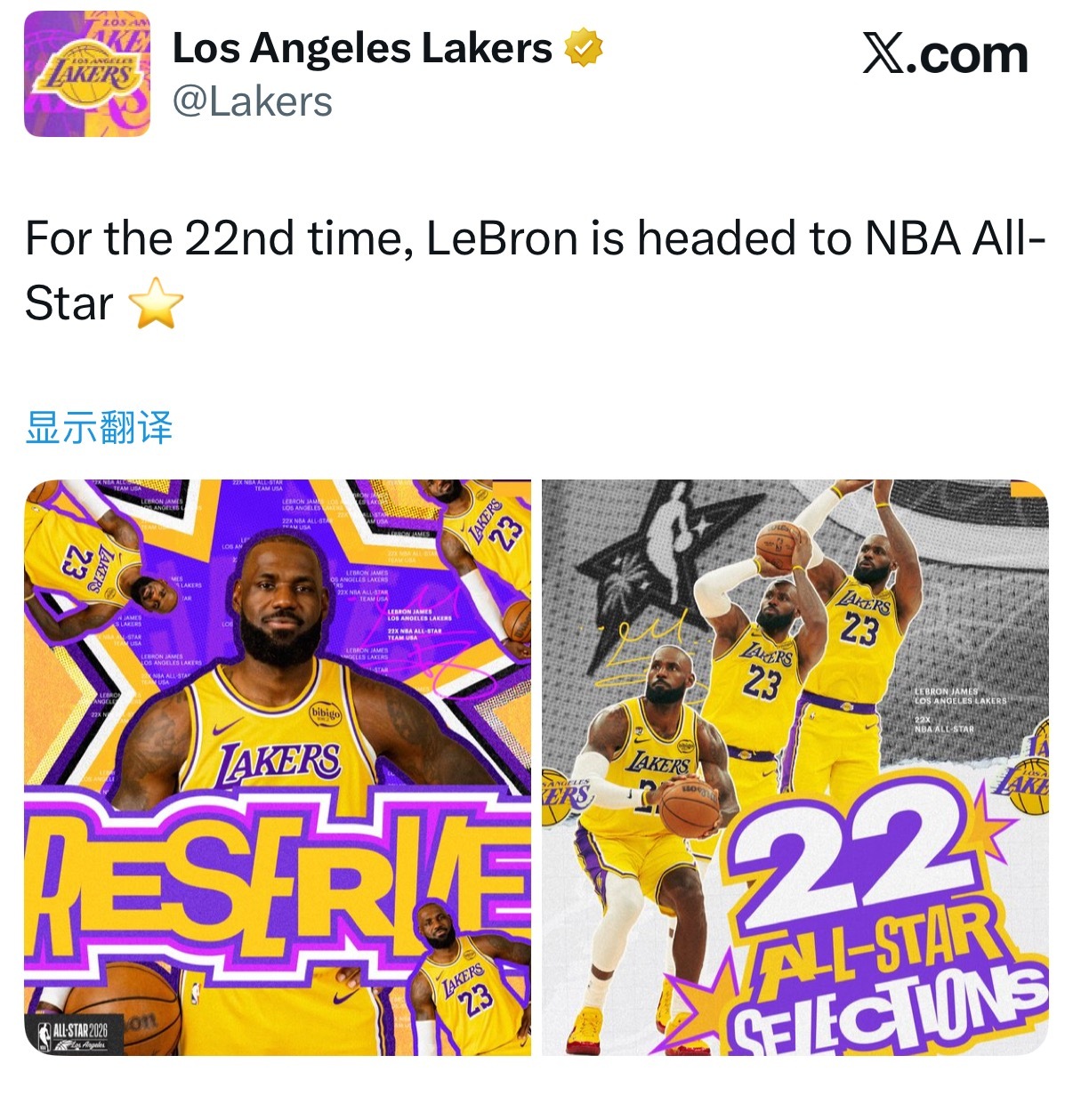 湖人官推祝贺詹姆斯22次入选全明星洛杉矶湖人