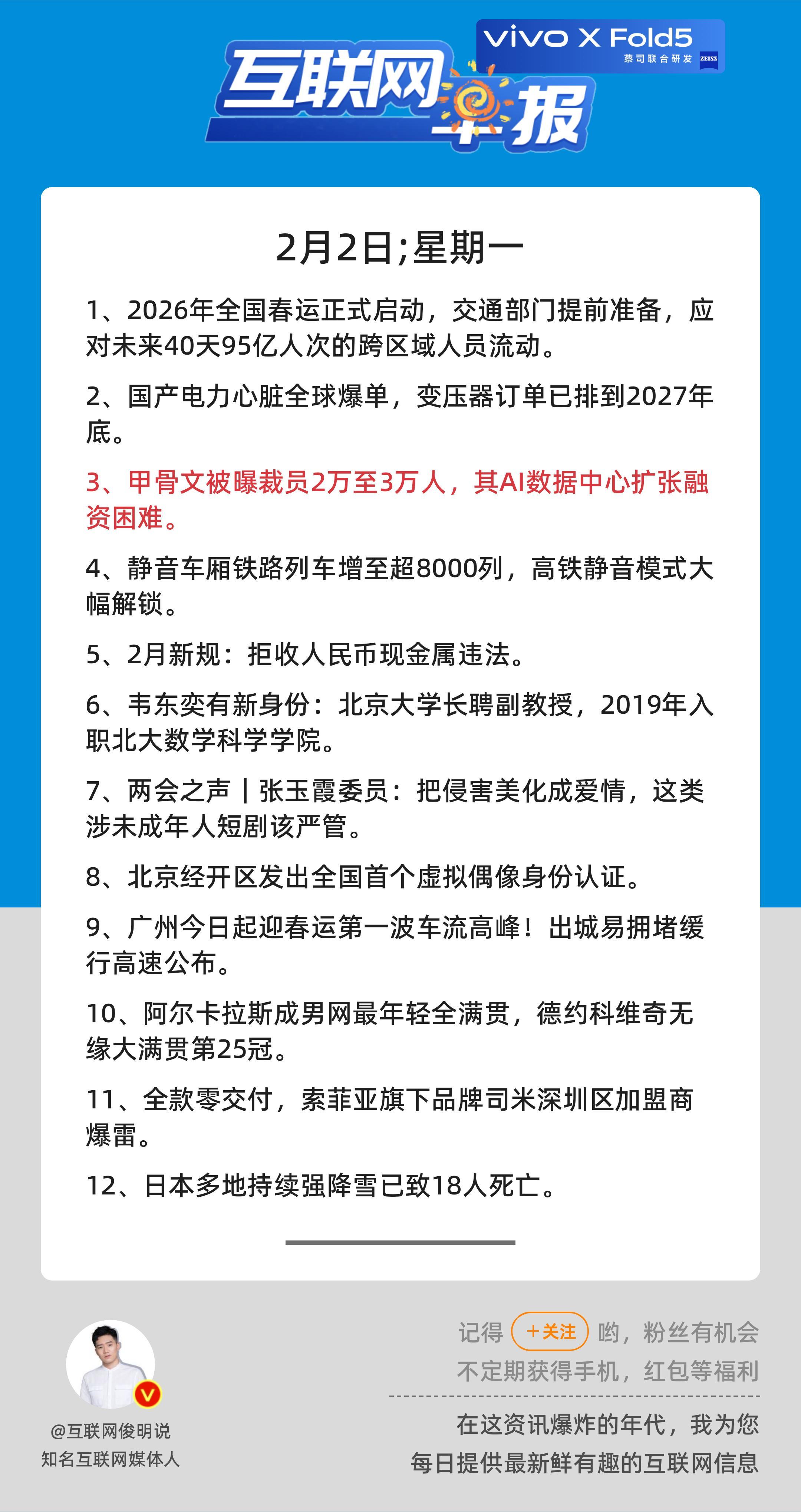 2月2日,星期一,《第3037期》;互联网早报,众览天下事关心第3条:甲骨文被曝裁员2万至3万人,其AI数据中心扩张融资困难;早安————————————点击右上方关注每天一分钟众览天下事,互联网早报值得拥有! 更多精彩,欢迎加入粉丝群俊明和他的朋友们