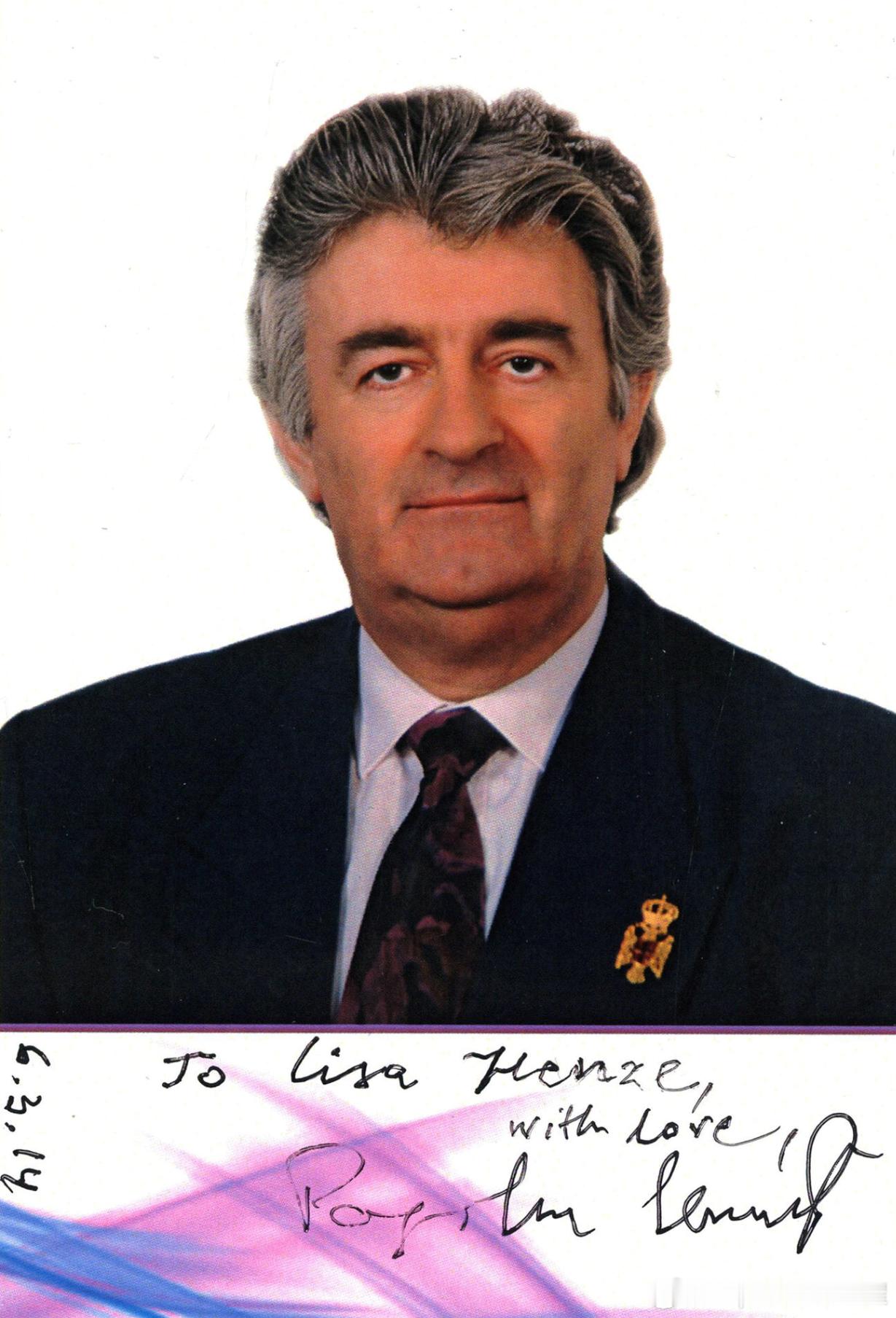 2014年6月3日波黑塞族共和国原总统Radovan Karadžić拉多万-卡拉季奇(1945.6.19-)签名照,照片拍摄于1990年历史影像