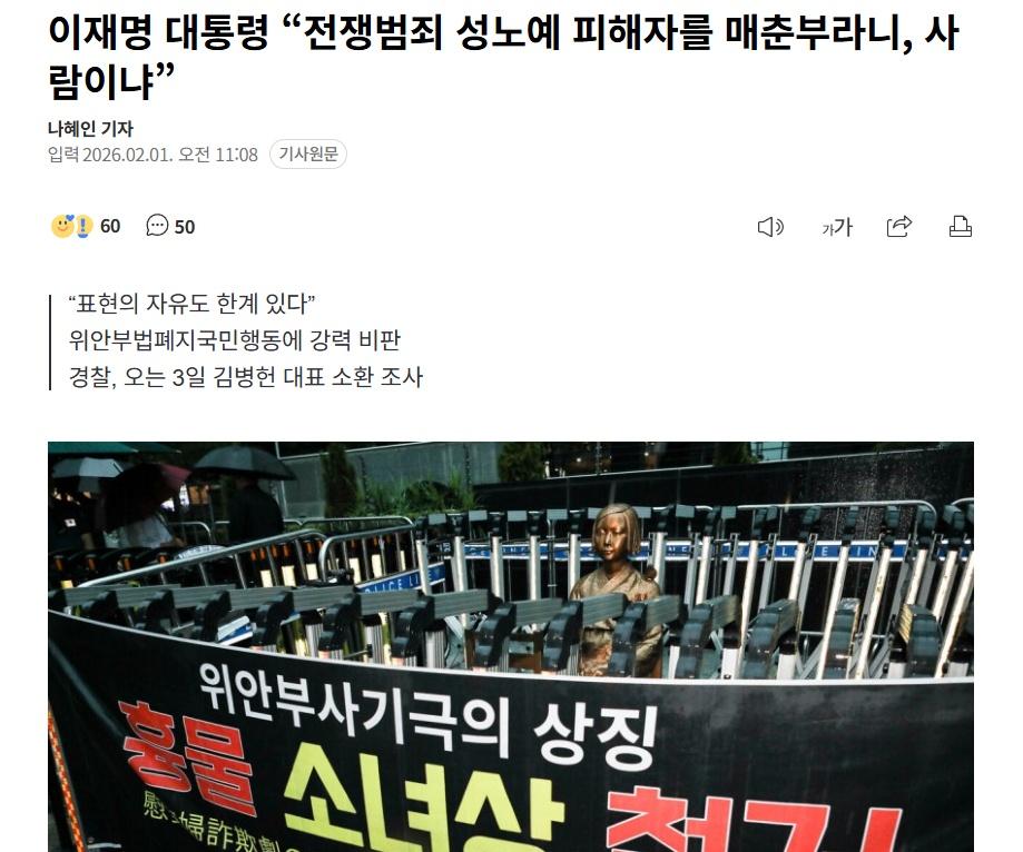 【韩国总统李在明怒斥侮辱慰安妇受害者的群体,称:“将受害者称为娼妓,你们还算是人吗?”】海外新鲜事 热点现场 韩国总统李在明强烈批评“慰安妇法废止国民行动”代表金炳宪,称“将战争犯罪性奴隶受害者称为娼妓,作为大韩民国国民,不,作为人,绝不能如此。” 李在明于1日上午在推特上转发了一篇关于调查某保守团体侮辱慰安妇受害者的报道,并发布了题为《人面兽心》的帖子。 据相关报道,瑞草警察厅明确指出,对于要求拆除“和平少女像”并侮辱慰安妇受害者的保守团体,“其行为明显超越了言论自由的界限”。针对该团体声称“慰安妇是历史歪曲”的主张,警方强调其内容“违背历史事实,是对学生的情感虐待行为”,并说明了搜查的正当性。此前,警方于上月19日以涉嫌毁损死者名誉、侮辱、违反《集会及示威相关法律》、违反《儿童福利法》等罪名对金代表的住所等进行了扣押搜查。 警方计划于3日上午10点以嫌疑人身份传唤金代表。 李在明痛心地说道:“她们被强行拖拽至战场,在死亡的恐惧中每日遭受数十次性暴力,直至最终被屠杀。你们怎么能披着人皮并对她们的痛苦如此残忍?” 他接着质问道:“你们无法同情那些含冤的战争犯罪受害者就算了,你们多年来游走于全国各地,将她们侮辱为‘娼妓’的那种热情、费用和时间,究竟从何而来?” 此外,他表示“言论自由也有其界限”,并对警方调查表示了鼓励和支持。李在明阐明:“自己享有自由的同时,他人也享有自由。在我们共同生活的社会共同体中,存在着必须遵守的秩序、道德和法律。自己的权利也伴随着以同等分量尊重他人权利的义务。人的世界应该由人来生活。为了建设人生活的世界,必须将伤害人的野兽改造成人或予以隔离。” 李在明上月6日也曾公开批评该团体,称其“令人无语的毁损死者名誉行为”。 “慰安妇法废止国民行动”于去年年底在设有少女像的瑞草高中、武学女子高中附近举行了未申报的集会,并展示了“在校园内设立慰安妇像是在指导娼妓就业吗?”等横幅。即使在警方介入调查后,该团体仍继续在钟路区原日本驻韩大使馆前举行的“周三集会”附近进行干扰示威等对抗集会。 对此,共同民主党议员徐美爱于去年12月提交了《慰安妇受害者法部分修订法律案》。修订案内容包括:加强对污损日军慰安妇受害者名誉或散布虚假事实者的处罚规定;新增对污损或侮辱和平少女像等纪念受害者象征物者的处罚规定等。