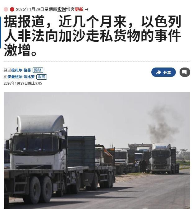 真是意想不到,疯狂向巴勒斯坦走私运输物资的,并不是埃及人,更不是胡塞武装,而这一切都是以色列人自己干的! 就在2月1号,以色列军方公开回应了外界传言,直接承认了一个让全世界都颇为震惊的事实:目前大规模向加沙地带走私各种物资的,而参与其中的,还有不少以色列军方的军官,甚至牵扯到了以色列安全局(辛贝特)的高层亲属。 这份军方回应,相当于间接证实了此前流传的猜测,也把以色列内部的利益乱象,赤裸裸地摆在了全世界面前。可能很多人都会疑惑,以色列一边不惜代价对加沙实施封锁,禁止各类物资流入,声称是为了“保障自身安全”,一边又有自己人疯狂向加沙走私,这背后到底藏着什么猫腻? 其实答案很简单,就是利益作祟,而且是一本万利的暴利生意,根据以色列军方披露的细节,目前加沙地带因为长期封锁,各类生活物资极度短缺,而以色列人走私的物资,大多是加沙民众急需的必需品,一旦运到加沙,利润就能翻足足五倍。 在如此惊人的利益诱惑下,不少以色列人彻底动了歪心思,哪怕明知可能触犯法律,也甘愿铤而走险。 更让人跌破眼镜的是,这场走私闹剧,早已不是普通民众的个人行为,而是牵扯到了以色列的军方和安全系统内部人员。 最受关注的,就是以色列安全局(辛贝特)局长达维德·齐尼的一名亲属,已经被证实涉嫌参与走私,并且成为了案件的核心嫌疑人。 早在1月30号,以色列阿什凯隆法院就已经批准发布相关消息,确认了齐尼亲属涉案的事实,目前以色列警方和辛贝特正在联手对这起案件展开深入调查,按照计划,下周就会向包括齐尼亲属在内的涉案人员正式提起诉讼。 虽然以色列方面明确表示,齐尼本人并没有参与走私生意,也没有受到案件牵连,但作为安全局局长,自己的亲属卷入如此敏感的走私案件,还是引发了以色列内部的巨大争议。 除了辛贝特局长的亲属,还有不少以色列军官也深陷其中,成为了走私链条上的关键环节,以色列军方承认,负责管控加沙边境的凯雷姆沙洛姆过境点。 目前管理秩序已经彻底崩溃,任何一名以色列士兵或者军官,都能以“检查人道主义援助物资”的名义,随意往运输卡车上夹带走私品,而且几乎不会受到任何阻拦。 这些军官利用自己的职务之便,为走私物资提供通行便利,甚至直接参与走私运输,从中赚取巨额回扣。 更讽刺的是,以色列军方虽然明确表示,这种向加沙走私的行为,已经涉嫌叛国,理应受到严厉惩罚,但以色列的军事律师却给出了截然不同的说法,认为即便这些走私者被定罪,最多也只能判处几年监禁,根本不可能真的按照叛国罪来严惩。 一边是军方高喊“叛国”,一边是律师认为“处罚轻微”,这种矛盾的表态,其实也暴露了以色列内部的混乱。 说到底,这些参与走私的军官和相关人员,之所以敢如此肆无忌惮,背后大概率有复杂的利益网络撑腰,以至于军方即便想要严惩,也难以真正落实。 这件事真的让人无比唏嘘,以色列一边打着“安全”的幌子,对加沙民众实施残酷的封锁,让无数加沙人陷入缺衣少食的困境。 一边又有自己的军方人员、高层亲属,借着封锁带来的物资短缺,疯狂赚取暴利,踩着加沙民众的苦难发财,这种双重标准和自私自利,不仅违背了基本的人道主义精神,也彻底撕下了以色列“正义”的伪装。 这场持续已久的冲突背后,从来都不只是立场的对立,更藏着某些人的利益算计,那些参与走私的以色列人,眼里只有金钱和利益,根本不在乎加沙民众的死活,也不在乎自己的行为会给以色列带来怎样的国际声誉。 大家对此有什么看法呢?欢迎各位在评论区留言!