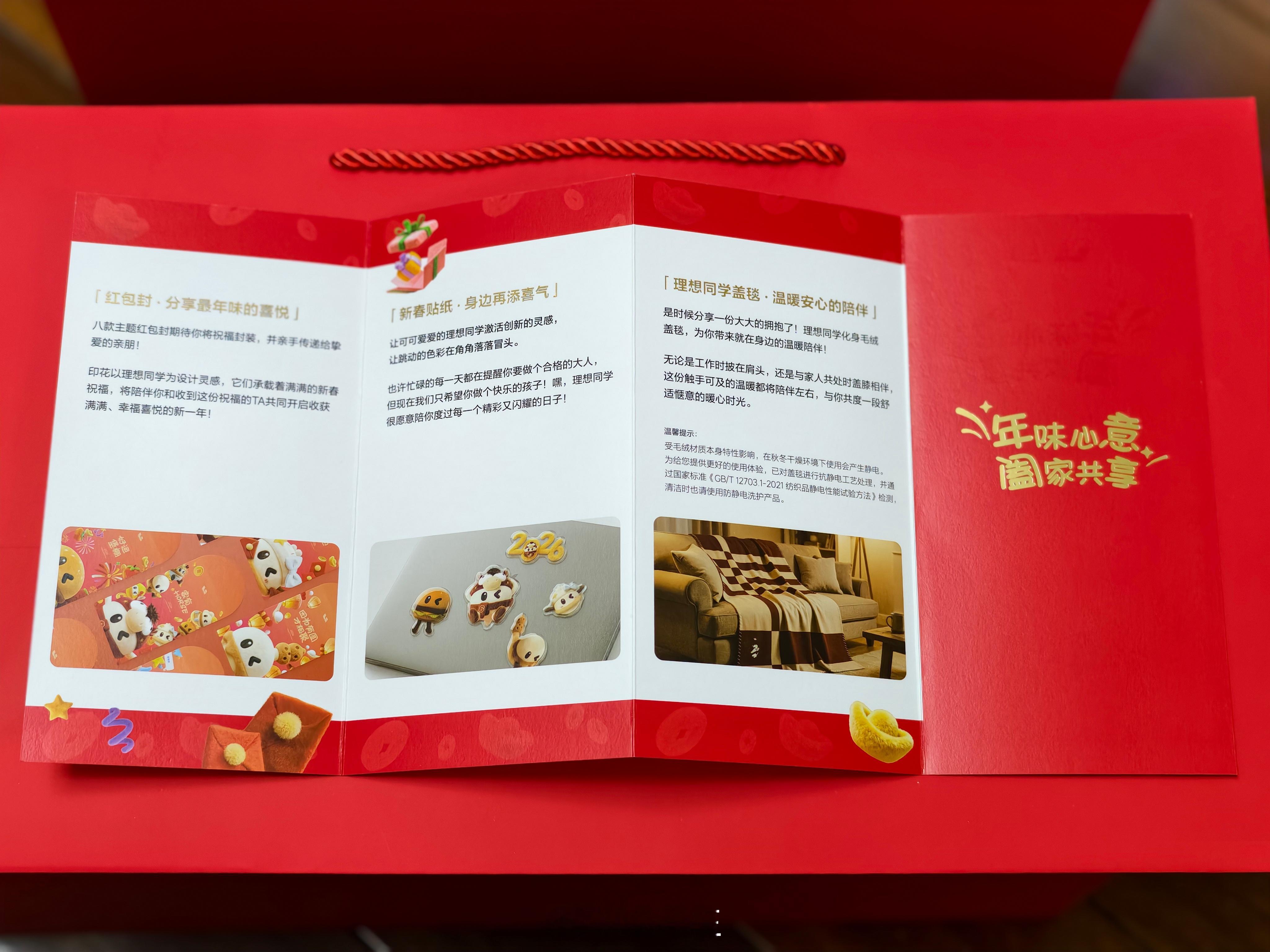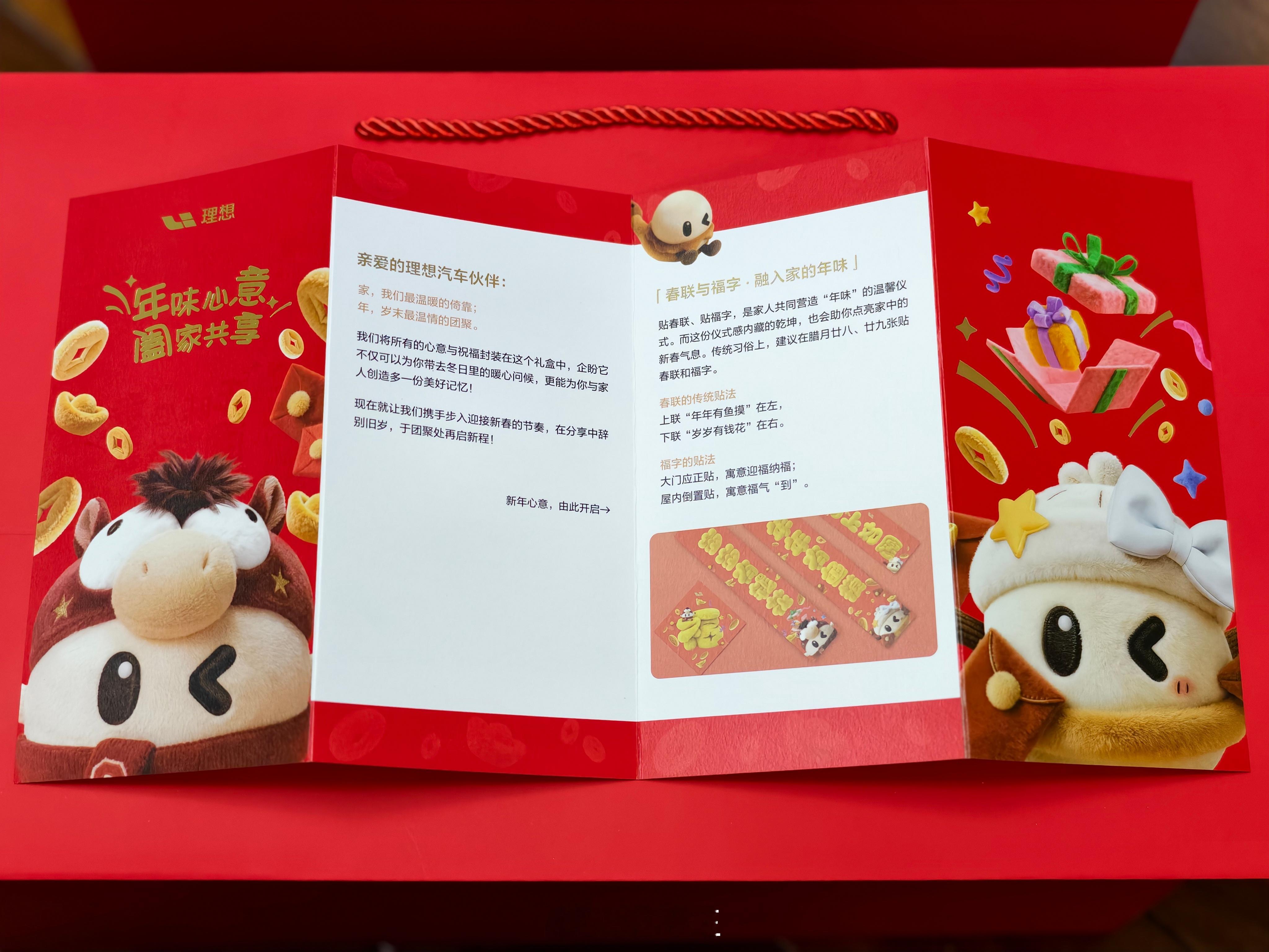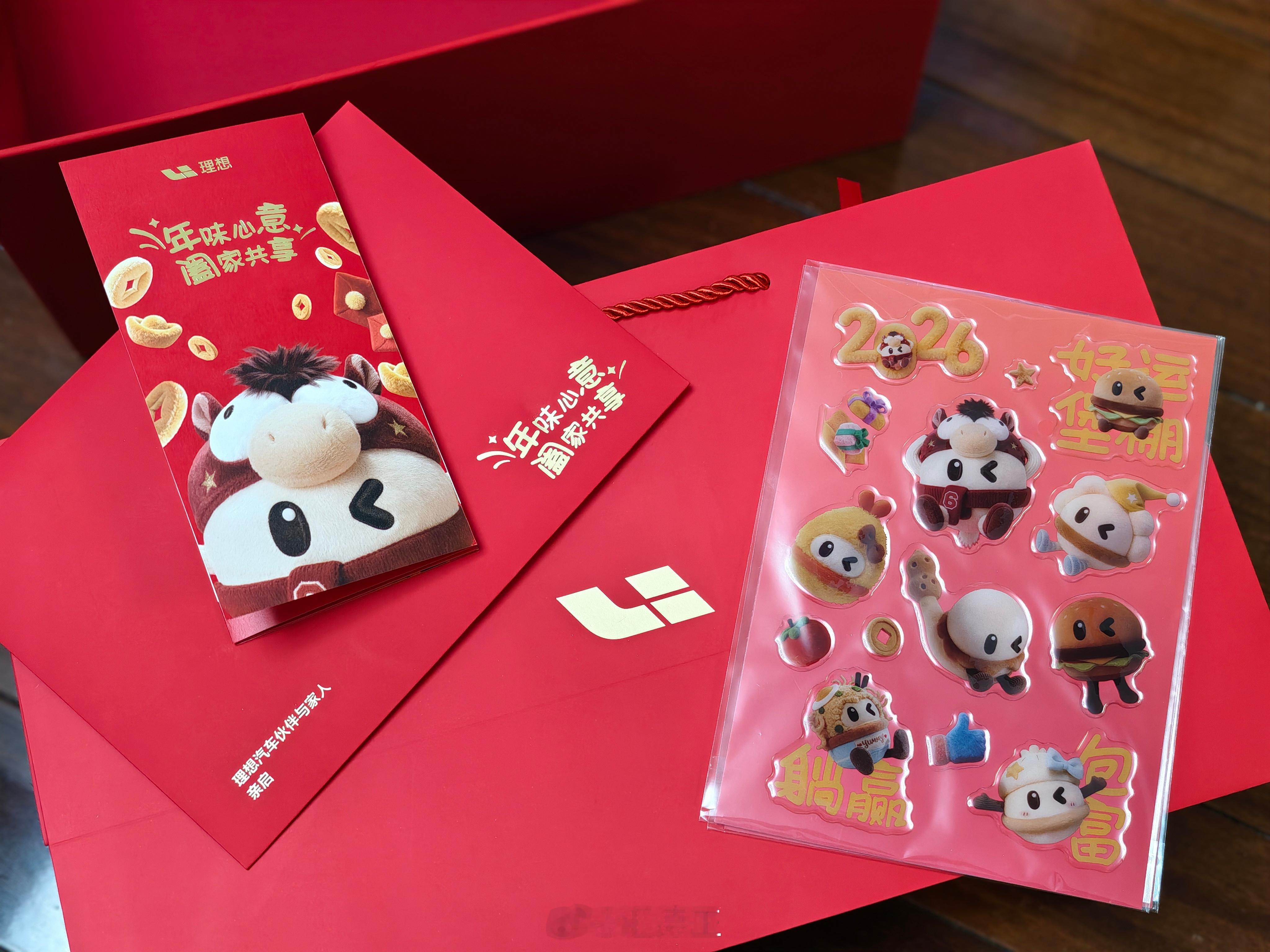 理想今年的新春大礼包内容很丰富啊,除了春联、贴纸和红包皮,还有一条非常实用的盖毯,在车里午睡时盖着可太合适了。各种新款毛绒理想同学设计的都太可爱了,给品牌部的设计师小伙伴们点赞!理想汽车