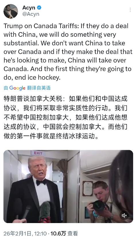 特朗普今天(北京时间2月1日)在空军一号上再次谈到加拿大和中国可能达成的贸易协议。特朗普表示:“如果他们(加拿大)和中国达成协议,我们将采取非常实质性的行动。我们不希望中国控制加拿大,如果他们达成他想达成的协议,中国就会控制加拿大。而他们做的第一件事就是终结冰球运动。” 熟悉近期局势的人都清楚,这已经不是特朗普第一次就中加经贸磋商发声,此前他就曾在社交平台发帖警告加拿大,甚至放话要对所有进入美国的加拿大商品加征100%的关税。 事实上,加拿大和中国近期达成的只是部分经贸共识,核心是加拿大给予中国电动汽车每年4.9万辆的配额,配额内享受6.1%的最惠国关税,中方则调整对加拿大油菜籽、部分农水产品的相关措施,加拿大总理卡尼也早就明确表示,该国无意与中国达成自由贸易协定。 特朗普却故意放大这件事,凭空扣上“中国控制加拿大”的帽子,就连加拿大的国球冰球都被牵扯进来,本质上就是担心加拿大脱离美国的掌控,担心中加合作会瓦解美国苦心经营的对华产业封锁。 此前美国财政部长贝森特就曾暗示,加拿大与中方达成的经贸共识是“180度大转弯”,还威胁称加拿大若签订相关协议,可能面临美国100%的关税,和特朗普的表态形成了呼应。 特朗普此次在空军一号上的发言,看似是针对中加贸易协议,实则是在向加拿大施压,想迫使加拿大放弃与中国的合作,彻底回归“美国优先”的框架,不许其在中美之间寻求平衡外交。 毕竟此前加拿大总理卡尼在达沃斯论坛上公开反对美方在格陵兰岛问题上的立场,还宣称“基于规则的旧秩序”已经结束,这让美国觉得加拿大有摆脱自身影响的倾向,此次便借着中加经贸的话题持续施压。 值得一提的是,特朗普此前的态度并非一直强硬,中加刚宣布经贸共识时,他还曾表示此举是“好事”,称“如果能与中国达成协议,就应该去做”,短短几天态度就发生了巨大转变,变脸速度令人咋舌。 而加拿大方面一直试图淡化美方的威胁,卡尼多次强调,与中国达成的经贸共识完全符合《美墨加协定》,符合加拿大的国家利益,加拿大会坚守自身的立场,不会轻易被美方的威胁所左右。 特朗普扯出冰球运动的说法,更是毫无事实依据,冰球作为加拿大的国球,是加拿大民众的精神图腾,中加之间的正常经贸合作,根本不可能涉及所谓的“终结冰球运动”,这番言论不过是他用来煽动情绪、抹黑中加合作的借口。 说到底,特朗普的这番表态,满是霸权思维的作祟,他无视加拿大作为主权国家的自主选择权,也无视中加经贸合作互利共赢的本质,只想着维护美国的自身利益,用威胁的手段打压一切不符合自身预期的合作。 中加之间的经贸磋商,从来都是平等相待、互利共赢的,不针对任何第三方,符合两国人民的共同利益,也顺应了经济全球化的潮流,特朗普的威胁和无稽之谈,终究无法阻挡中加合作的正常推进。
