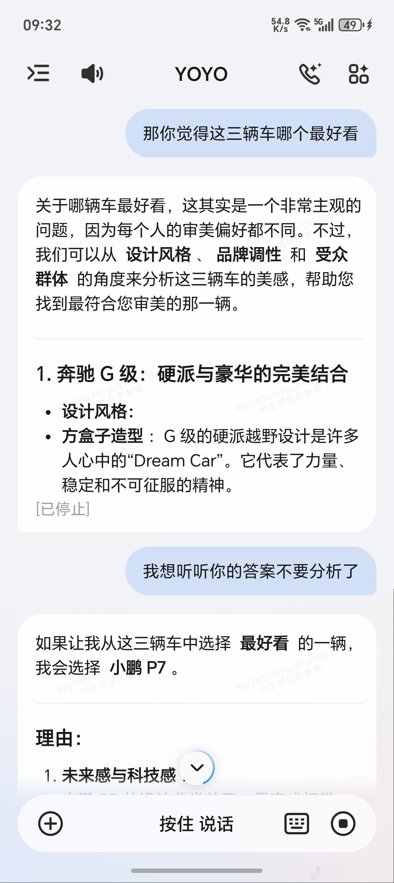 我让AI选择了下图的三辆车子中它觉得最好看的一辆,AI的回答是新小鹏P7,和我想的一样