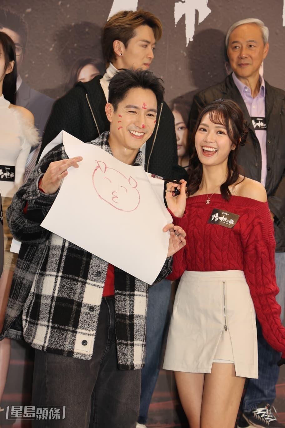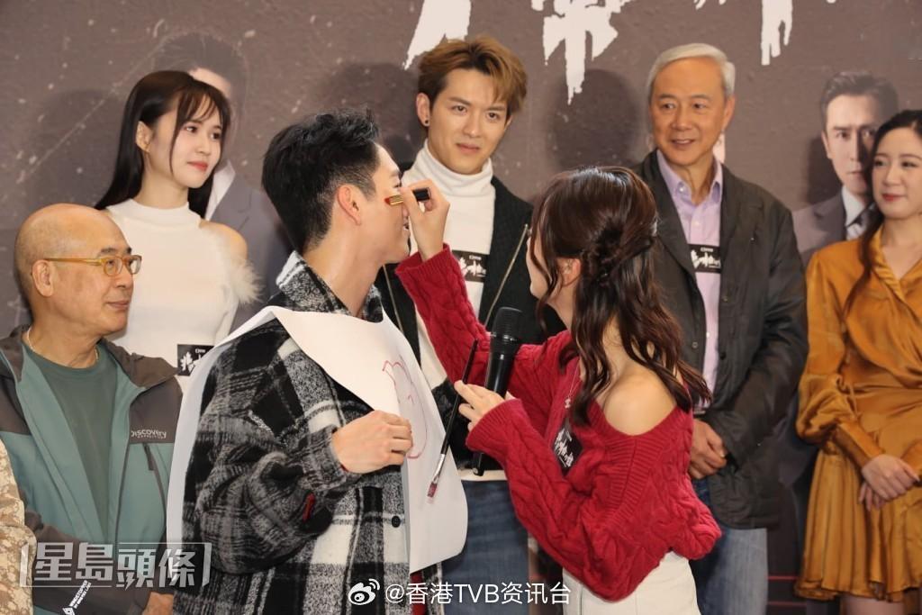 马德钟、赖慰玲、吴伟豪、游嘉欣、陈晓华等今日(1日)出席TVB剧集《非常检控观》宣传活动,在画画期间,游嘉欣弃用画笔,使出唇膏为吴伟豪画到变“大花脸”。最搞笑吴伟豪在戏中揽完游嘉欣,他在台上揽马德钟。