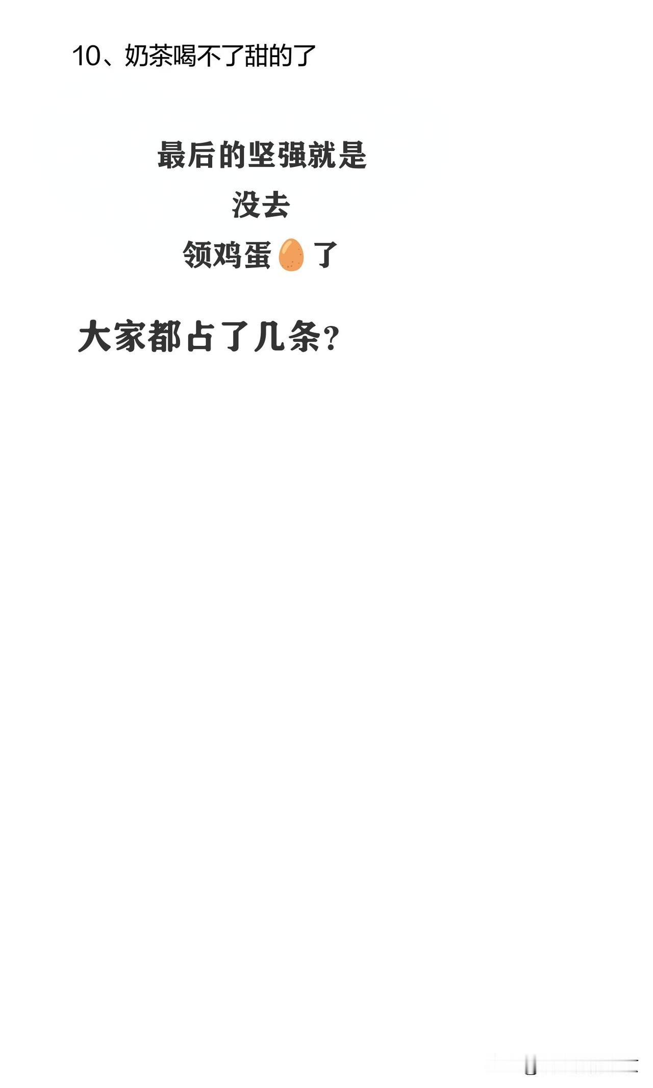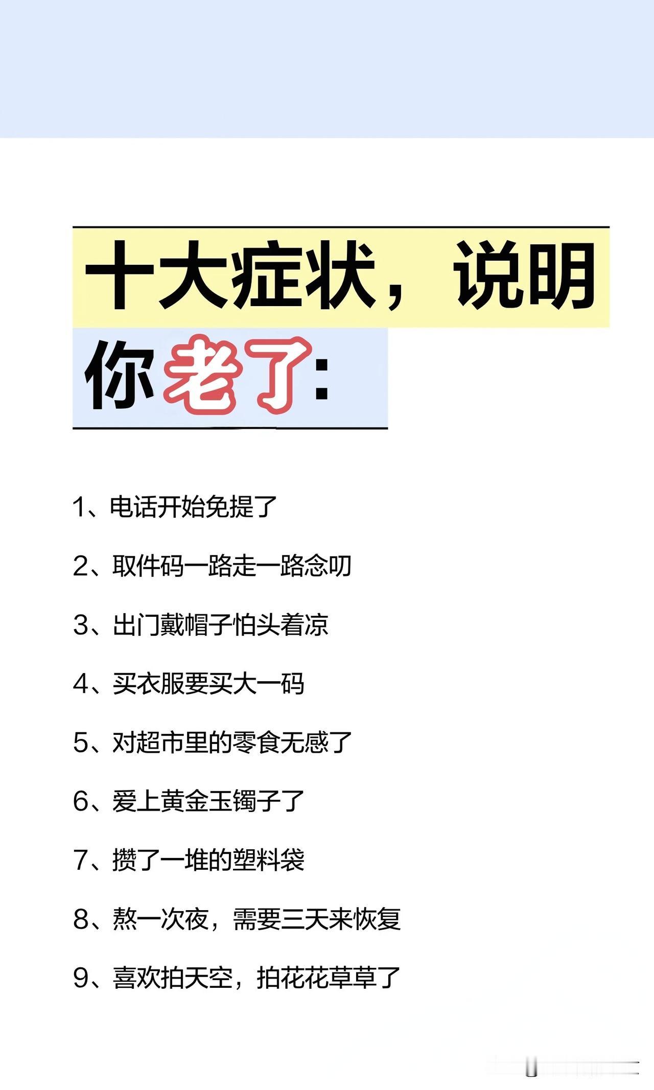 十大症状,说明你老了 不知道从什么时候开始: 接打电话爱直接开免提了, 取个快递都得念好几次取件码, 不论去哪儿都喜欢戴帽子戴口罩,喜欢宽松的衣裤, 去超市时对以往那些琳琅满目垂涎三尺的零食也无感了, 开始喜欢真金白银了, 喜欢拍花草树木和天空了, 不喝太甜的奶茶了 而 最后的坚强就是没有去跟风“领鸡蛋”了[捂脸] 大家占了几条?