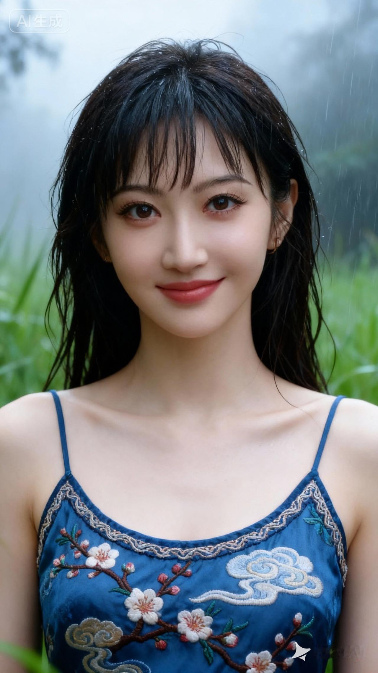 夜晚街头的优雅蓝裙少女,微笑如月光般迷人。