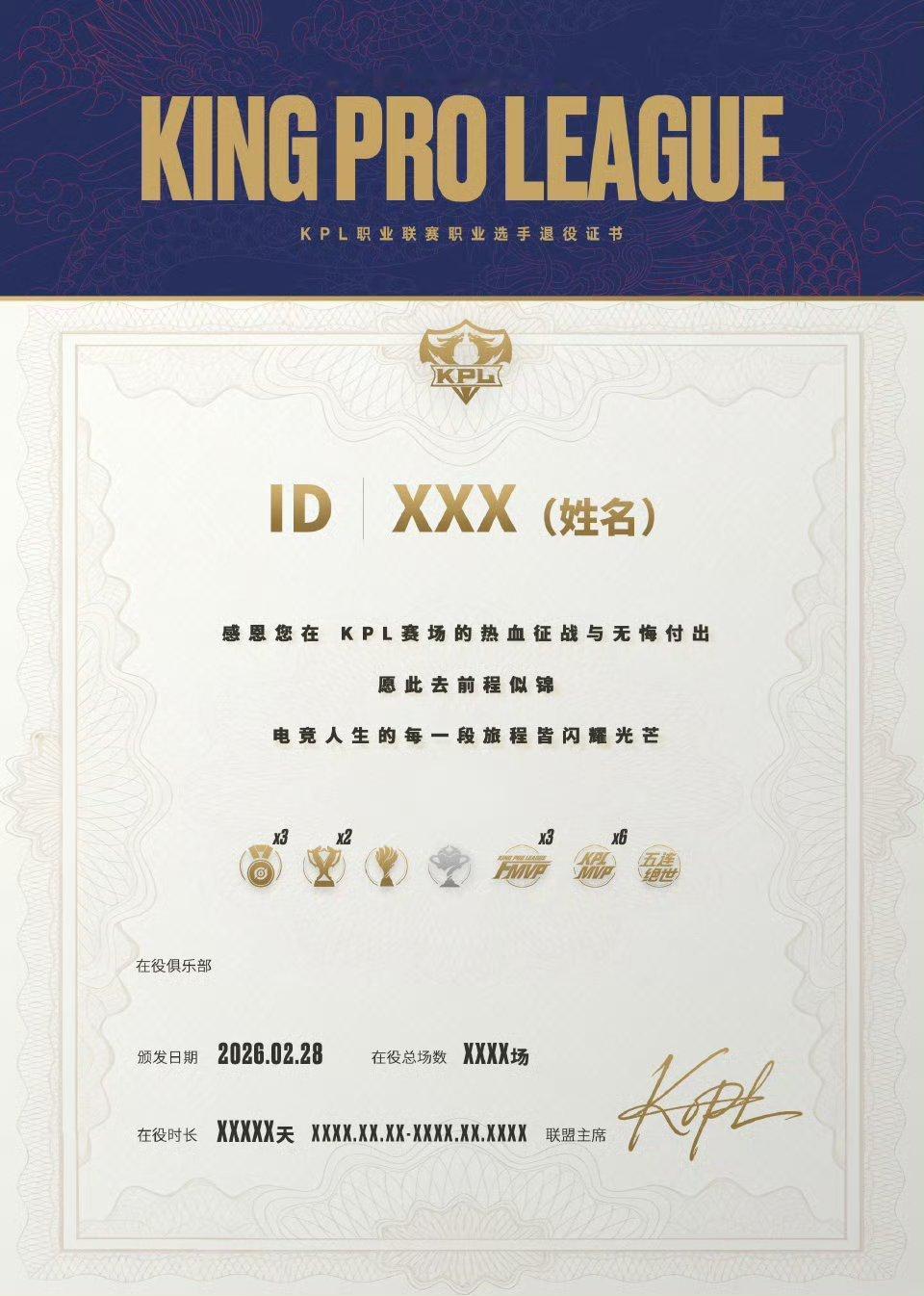 KPL十周年特别企划 选手致敬典礼 & 退役证书颁发为纪念KPL十年征程,官方将举办选手职业生涯致敬典礼,并为所有提交退役申请的选手颁发退役证书。致敬典礼安排- Cat(陈正正):2月26日赛后,成都AG电竞中心