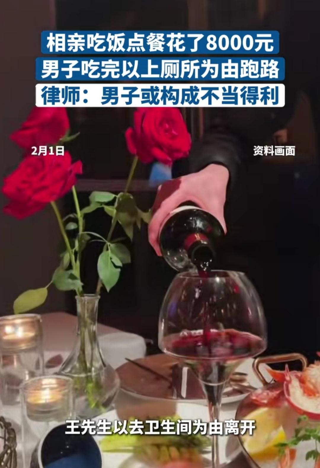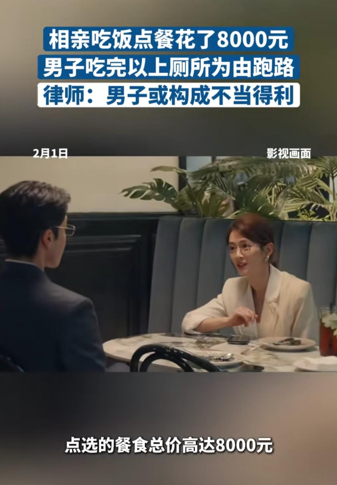 这年头相亲饭局真是越来越离谱了!本以为是一场双向奔赴的浪漫见面,谁能料到最后演变成大型“逃单”现场,这抓马剧情简直比电视剧还让人瞠目结舌。 2月1日,有相亲局曝出猛料,两人吃饭直接点了8000元的菜品,酒足饭饱后,男方借口去厕所,居然直接溜之大吉,留下女方独自面对天价账单,只能硬着头皮全额垫付。 大家忍不住猜测,男方是早就预谋好白吃白喝,还是看到账单金额后才临时起意跑路?律师也出来发声,这种行为或构成不当得利。 舞台上的光鲜相亲,背后藏着多少算计和无奈。到底是谁的问题?这事儿还真不好说,是非对错,还是交给大家来评判吧。