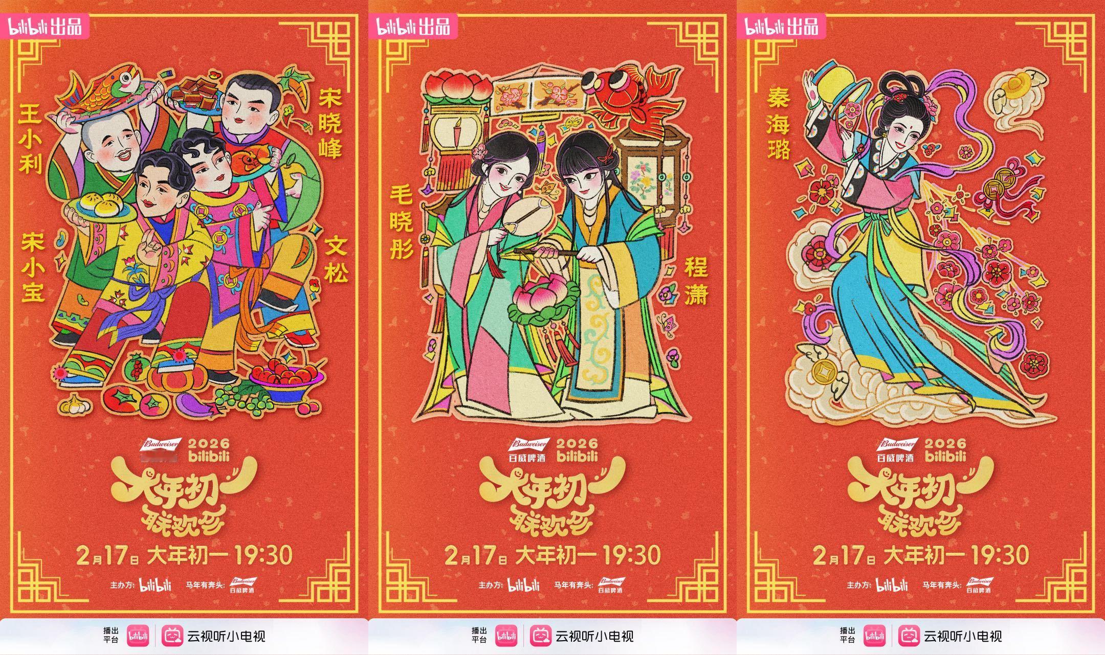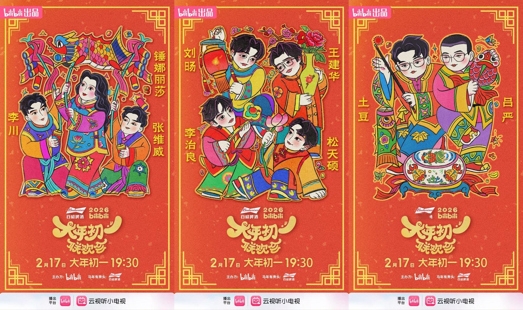 救命,我真的被b站笑晚这组艺人阵容年画海报震撼了这四士同堂、外星从、胖达人简直是越看越喜庆!还有毛晓彤、程潇、秦海璐,果然漂亮的人在哪里都这么好看。加上这配色,年味儿直接拉满,请问这套物料就不能做成实体吗?我想马上拥有!!!过年就是要看这种有质感、有底蕴、还带点小俏皮的东西。这波啊,B站确实在大气层!B站大年初一联欢会官宣阵容B站大年初一联欢会