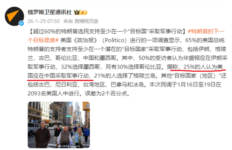 这项调查是在2026年1月16日至19日进行的,覆盖2093名美国成年人,误差范围为±2个百分点。被问及是否支持对一系列国家或地区采取军事行动时,川普的支持者表现出明显的“好战倾向”:65%的人至少支持对其中一个目标动武。其中,伊朗以50%高居榜首,墨西哥32%,哥伦比亚30%,而中国大陆排在第四,占25%。更值得注意的是,这份名单里还包括格陵兰、古巴、台海、巴拿马甚至冰岛。