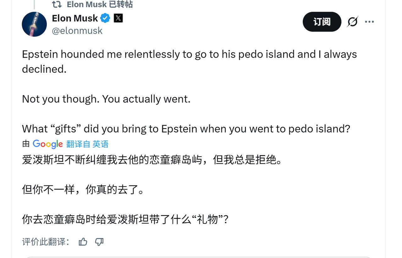 看起来马斯克确实很冤枉,他说: “爱泼斯坦不断纠缠我去他的恋童癖岛屿, 但我总是拒绝。”