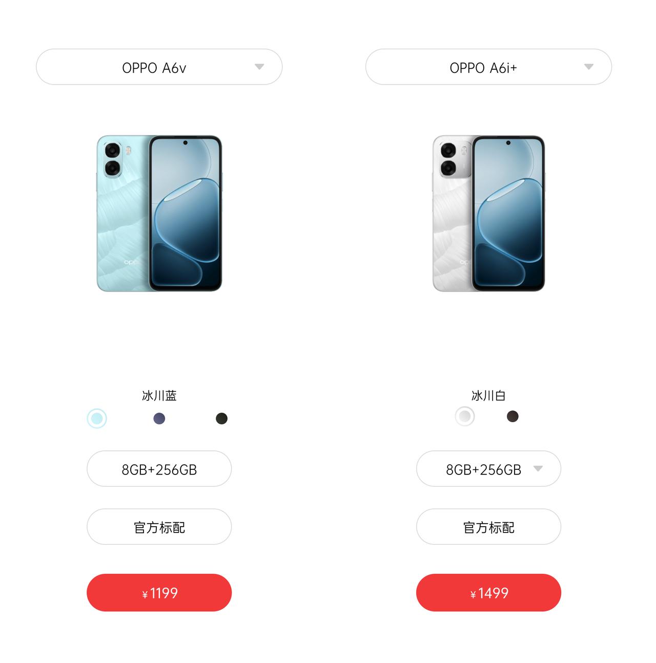OPPO A6 宇宙扩充,OPPO A6v 和 OPPO A6i+ 上架 OPPO 商城,两款手机配置大体相当,在前置镜头、屏幕亮度、电池容量、防水等级上有差异。 OPPO A6v,8+256GB 售价 1199 元 OPPO A6i+,8+256GB 售价 1499 元、12+256GB 预售 1599 元、12+512GB 预售 1799 元 - 芯片:联发科天玑 6300 处理器,LPDDR4X 内存,UFS 2.2 闪存,3900mm² VC 均热板; - 屏幕:6.75 英寸 1570×720 LCD 屏幕,120Hz 刷新率,240Hz 触控采样率,手动最高亮度 900nits(A6v 手动最高 700nits),全局激发亮度 1125nits,8bit 色深,硬件级 DC 调光; - 相机:A6i+ 前置 8MP / A6v 前置 5MP,后置 50MP 主摄 + 2MP 黑白双摄; - 续航:7000mAh 电池(A6v 6500mAh),支持 45W 快充,OTG 反向充电; - 其他:厚 8.61mm,重 216g(A6v 212g),冰川白、栗绒棕 2 款配色,(A6v 冰川蓝、钛岩紫、旷野绿),支持 Wi-Fi 5、USB 2.0,侧边指纹识别,IP66 & IP68 & IP69 防尘防水(A6v 支持 IP64 防尘防水),支持 MicroSD 卡扩展,A6i+ 有 300% 立体声双扬声器,A6v 有 3.5mm 耳机孔,ColorOS 16 系统。