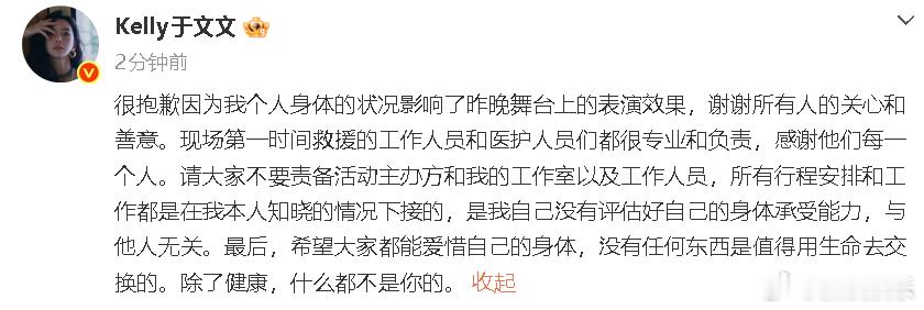 【于文文希望大家都能爱惜身体】于文文称未评估好身体承受能力2月2日,发文回应在演唱会晕倒,她感谢大家的关心,称工作人员和医护人员都很专业,希望大家不要责备活动主办方和工作人员:“是我自己没有评估好自己的身体承受能力,与他人无关。”她希望大家都能爱惜身体:“除了健康,什么都不是你的。”