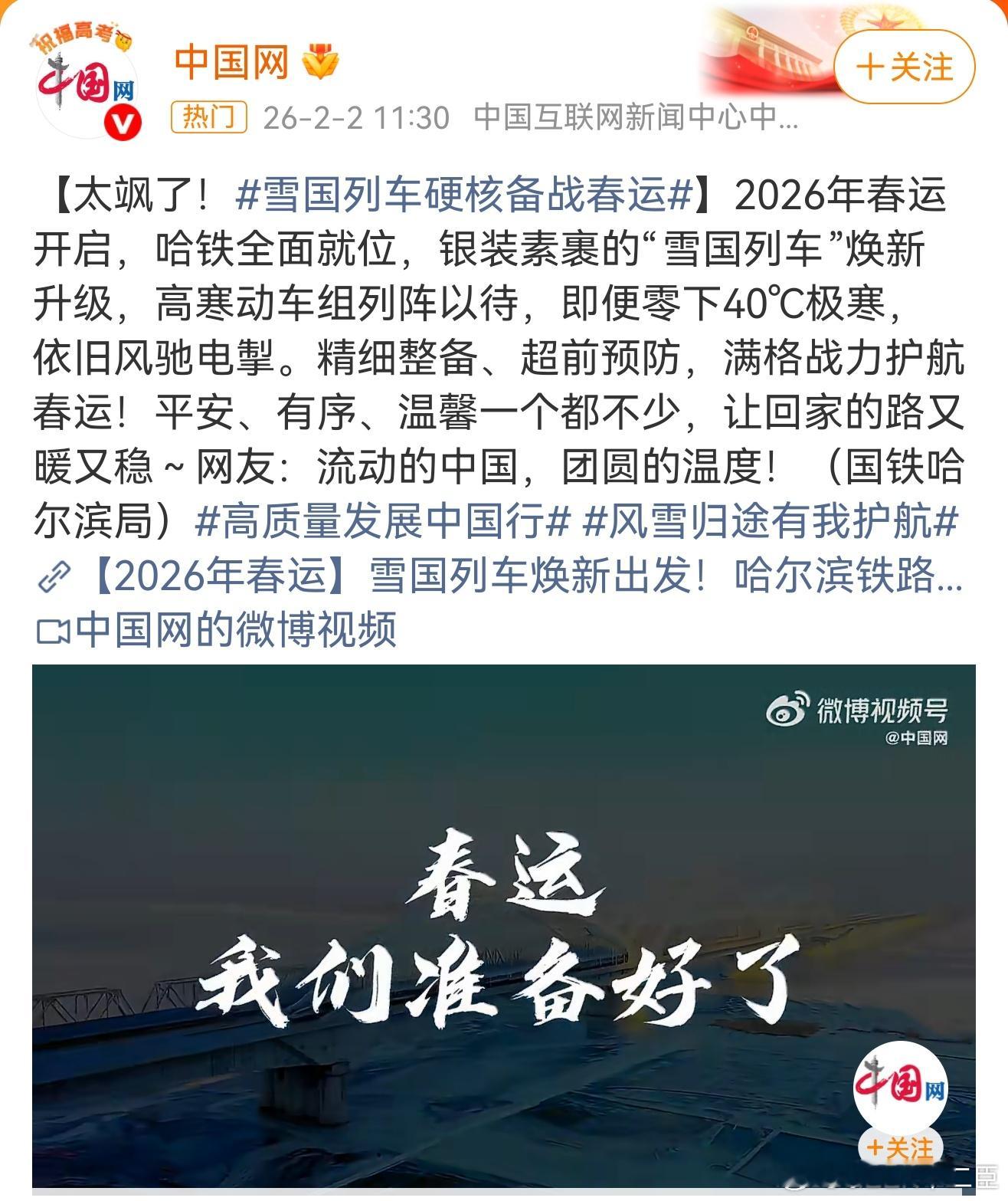 雪国列车硬核备战春运 在冰天雪地里保障春运,考验的不只是设备,更是责任。哈铁从容应对极寒挑战,细致做好列车整备升级,背后是对旅客平安的郑重承诺。团圆路上,这种不张扬却处处用心的守护,恰恰传递出最扎实的温暖。为哈铁的专业与担当致敬!高质量发展中国行风雪归途有我护航