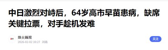 中日激烈对峙后,高市早苗突发疾病,缺席关键拉票,对手趁机发难   “选举都到冲刺