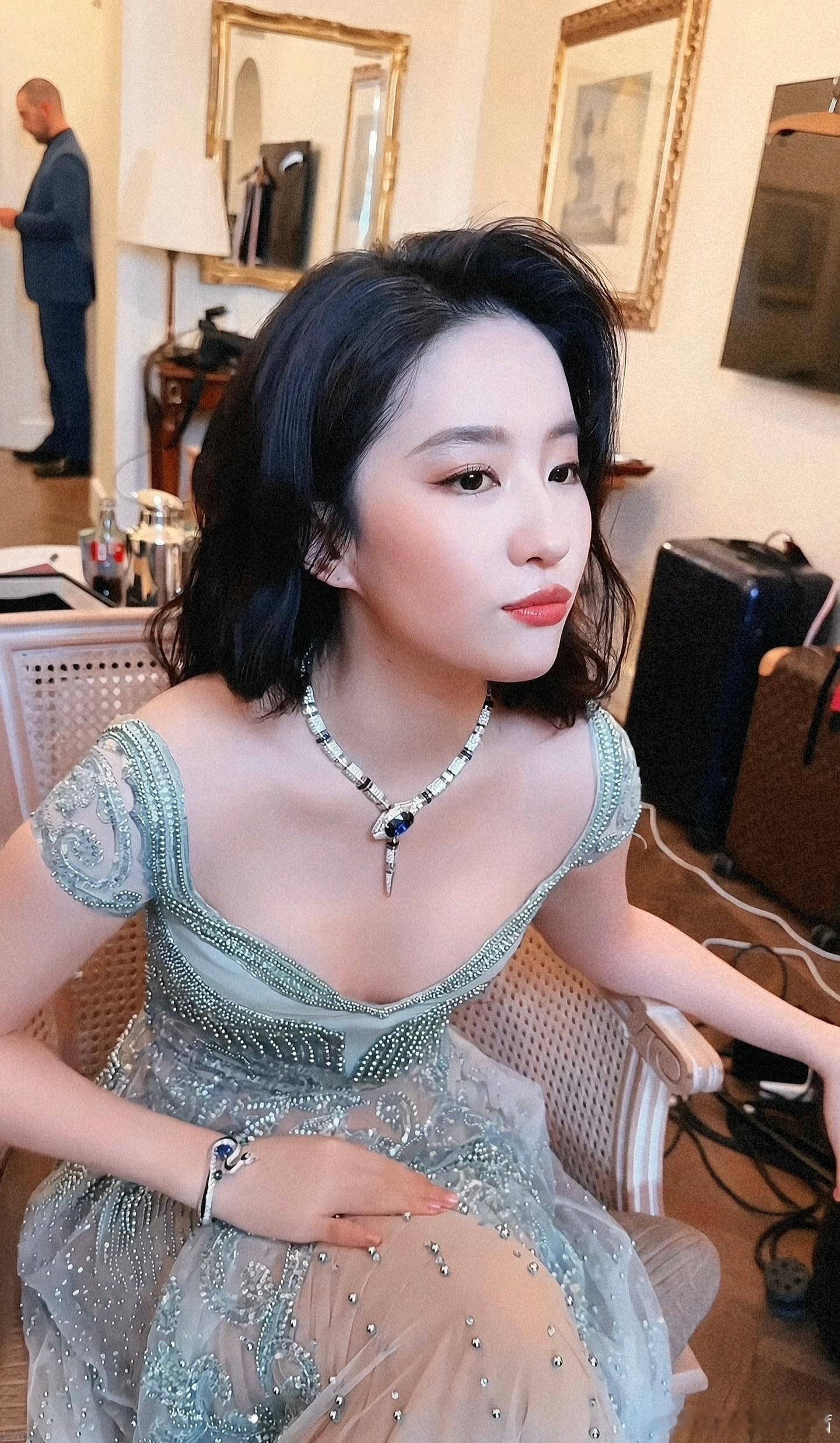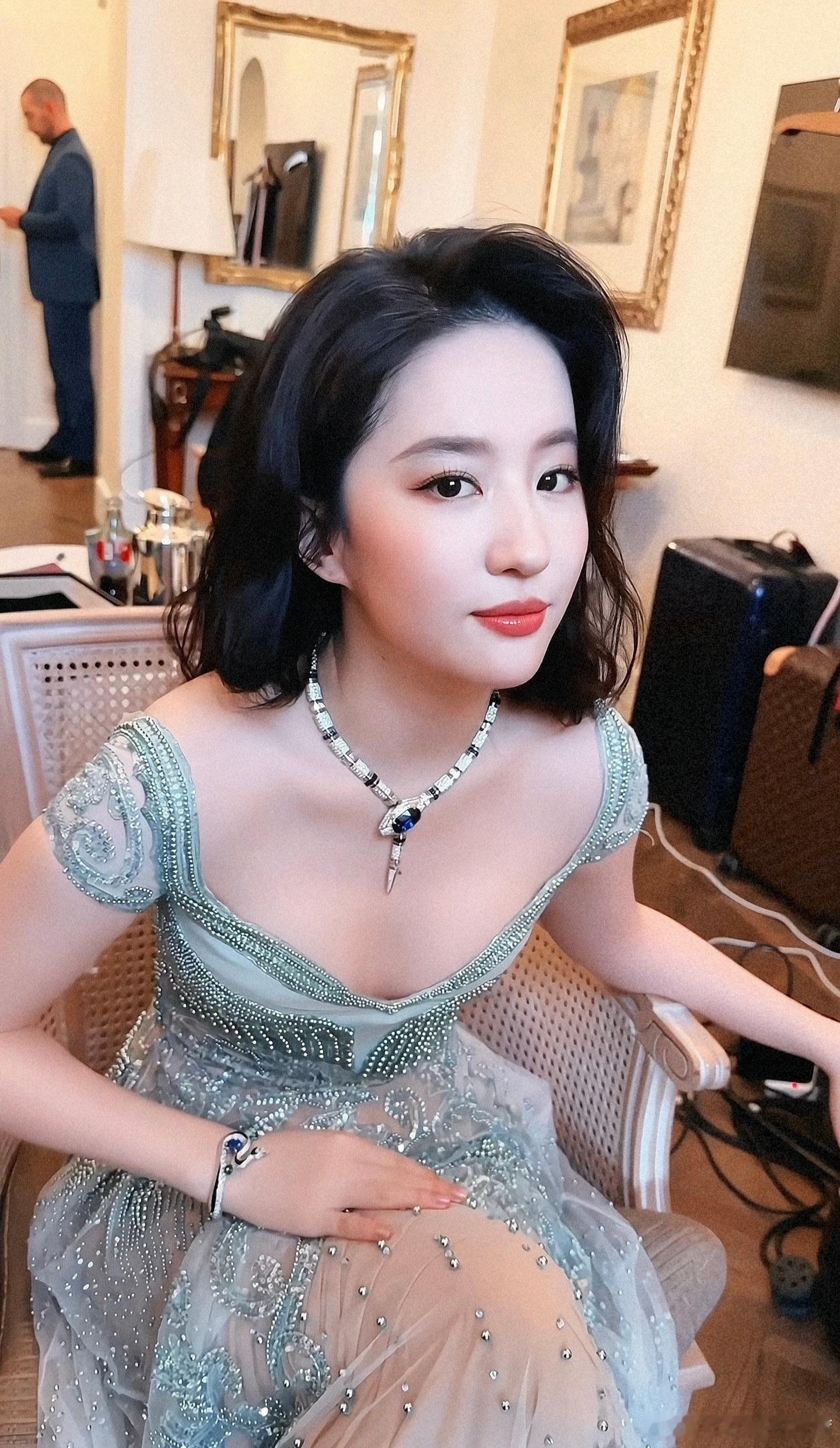 刘亦菲身着一袭薄荷绿与裸色渐变的礼服裙,裙身钉珠与刺绣花纹在光线下泛着细碎光泽,大V领设计勾勒出优美颈部线条,短袖蕾丝刺绣更是精致柔美。