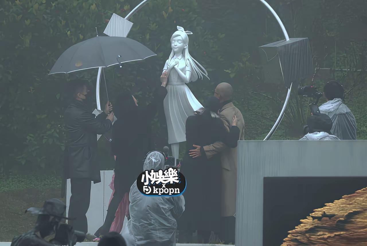 大S的雕像终于揭幕了,S妈与具俊晔相拥而泣。 这尊由具俊晔耗时一年打造的雕像高约两米二,主体是少女姿态的大S形象:她双手合十置于胸前,双眼轻闭,神情宁静安详,长发自然垂落,裙摆轻盈舒展,如同天使一般温柔圣洁。纯白的汉白玉材质,在雨雾里泛着温润的光,让整个身影更显空灵。 从大S下葬那天到这场揭幕仪式,全程都下着大雨,淅淅沥沥的像是天地共寄的哀思,打湿了雕像的裙摆,也模糊了现场所有人的眼眶。 当S妈紧紧搂住这尊神态与女儿相似的雕像时,熟悉的眉眼、温柔的姿态瞬间击溃了她的情绪防线,让她泣不成声。大s具俊晔