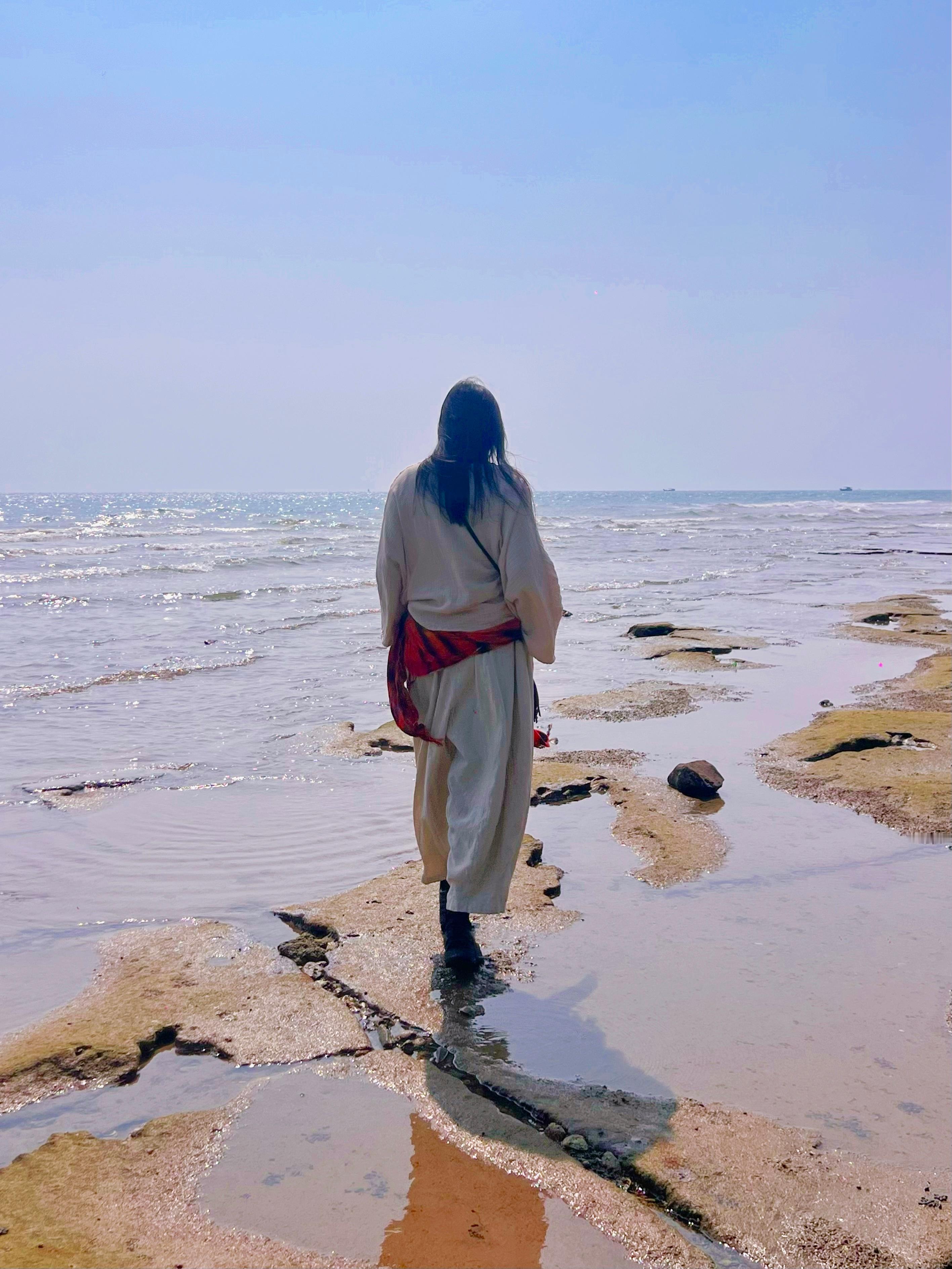 五彩滩是火山岩基海蚀地貌,应该拍那些20–50米高海蚀崖、大家来这里都是当网红打卡拍那种,但我早上在跟Chris闹别扭🦊不理睬,没人给我拍,我儿子满心思只有挖海胆就随便给我咔嚓了两张,一点地貌特征都没拍进去。