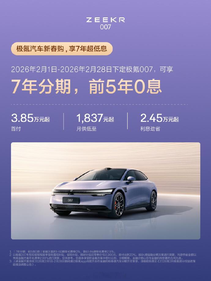 极氪 推出全系车型的7年低息金融方案:消费者购买极氪车型时,首付最低为2.98万元,月供则从1615元起。特别地,极氪007、007GT和009三款车型还享有专属的7年金融方案,其中前5年为0息分期,7年超低息。