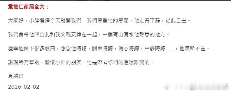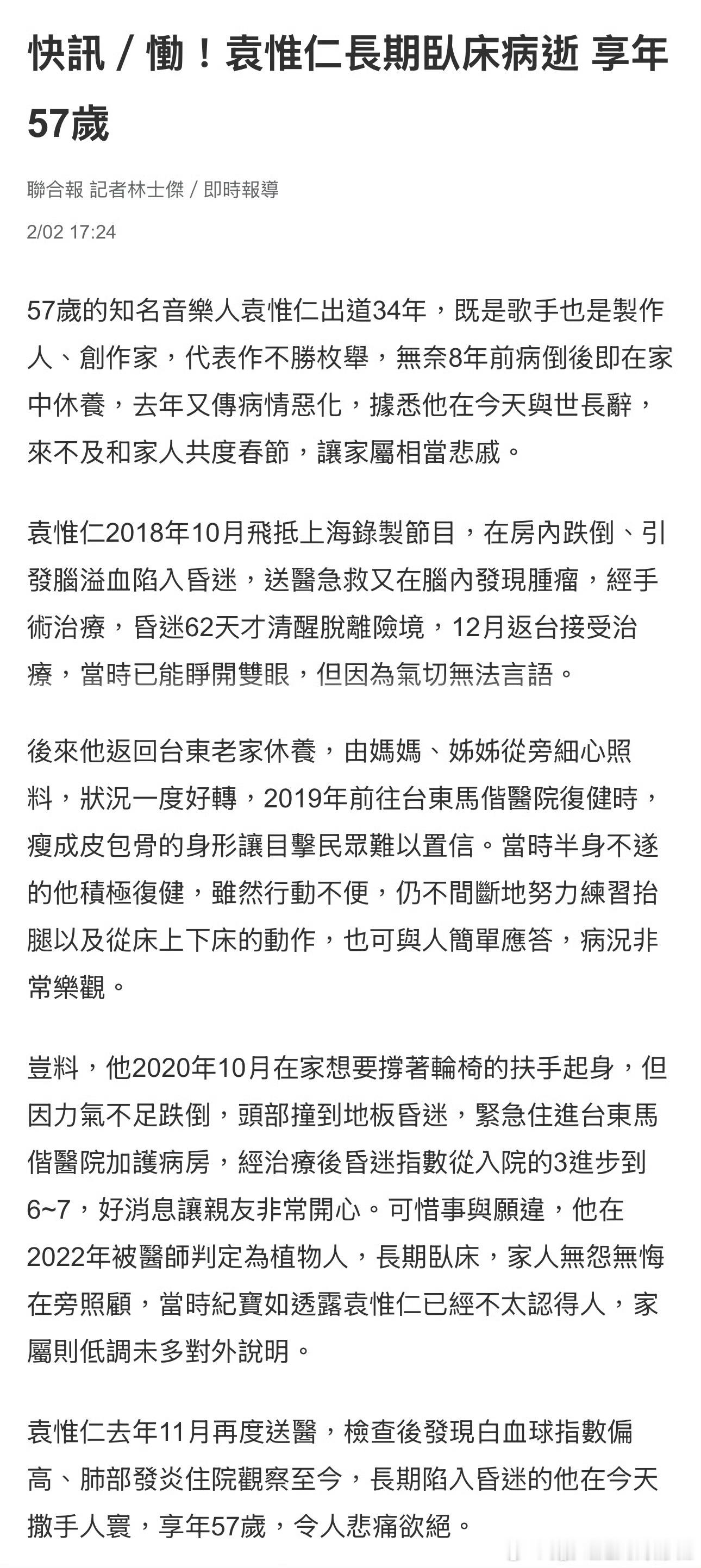 据台媒,著名歌手音乐制作人袁惟仁去世,享年57岁。 袁惟仁去世